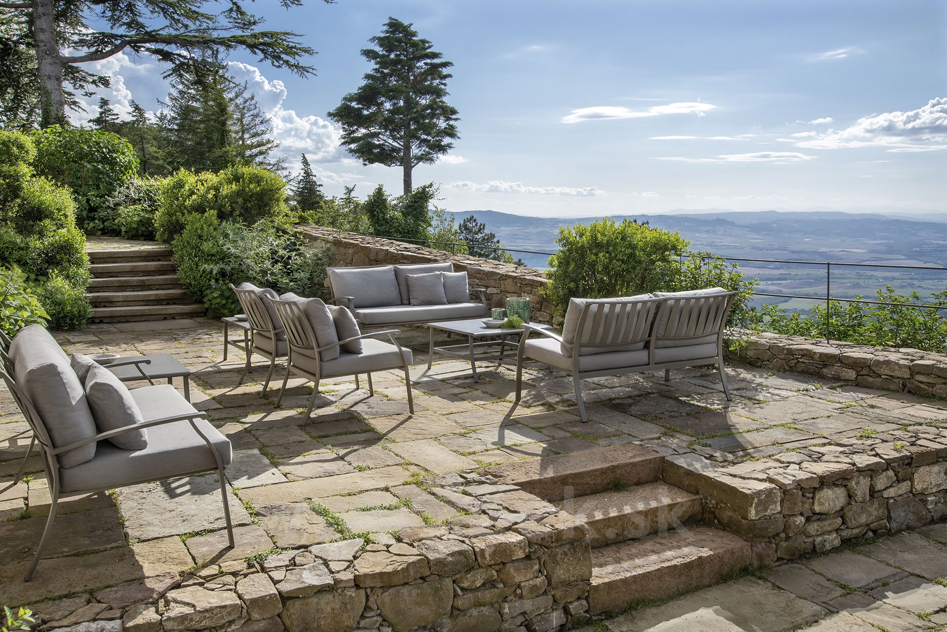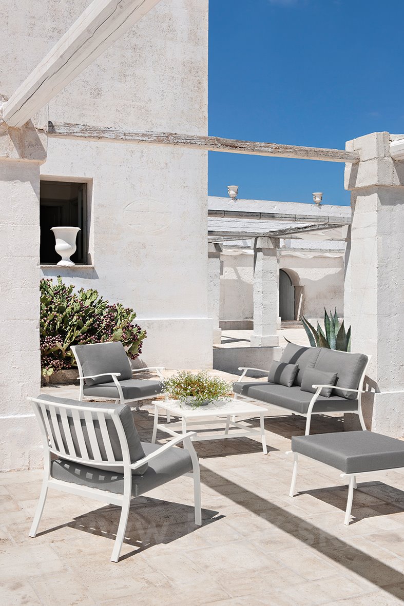 Táto kolekcia oceľového nábytku, inšpirovaná klasickými prvkami, vykazuje nadčasový štýl, ale je pripravená splniť všetky potreby súčasného vonkajšieho prostredia.