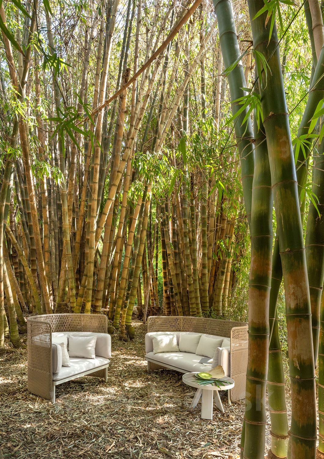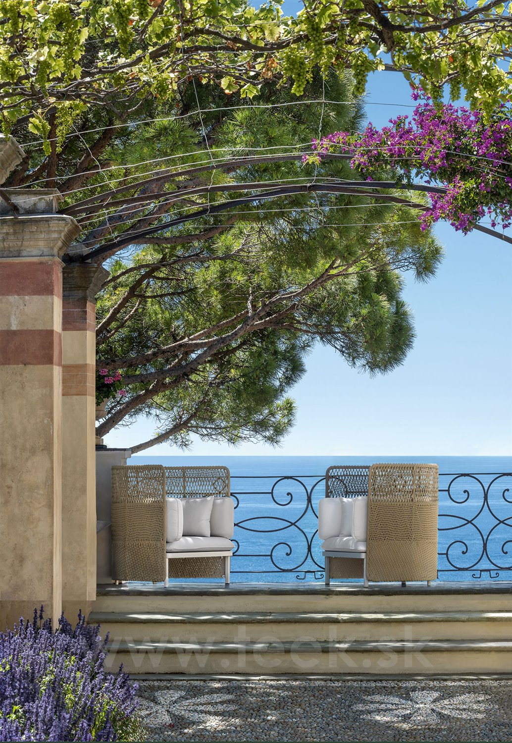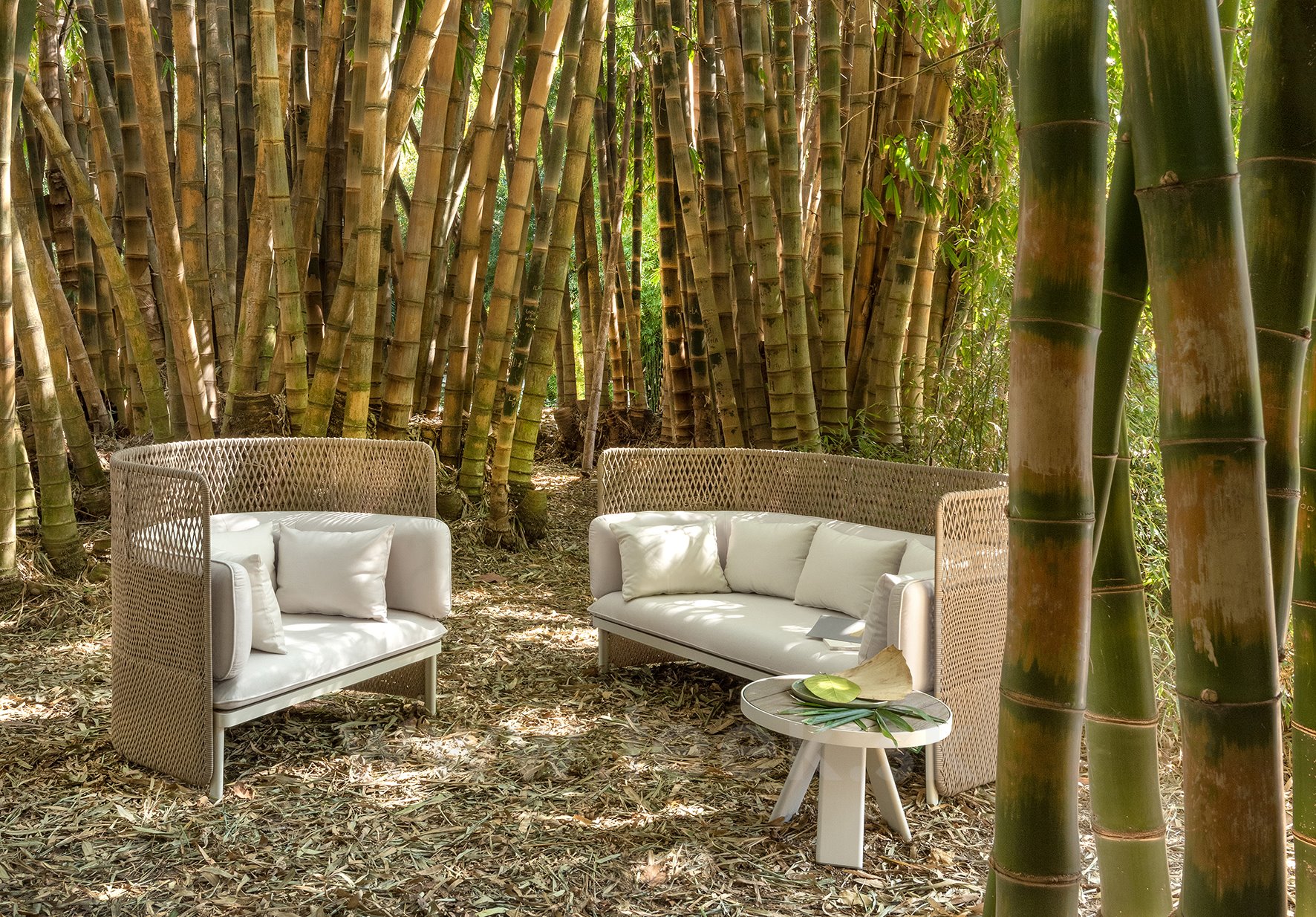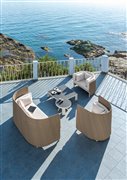 Pohovky a kreslá z hliníka a ratanu a konferenčné stolíky z hliníka a teakového dreva.