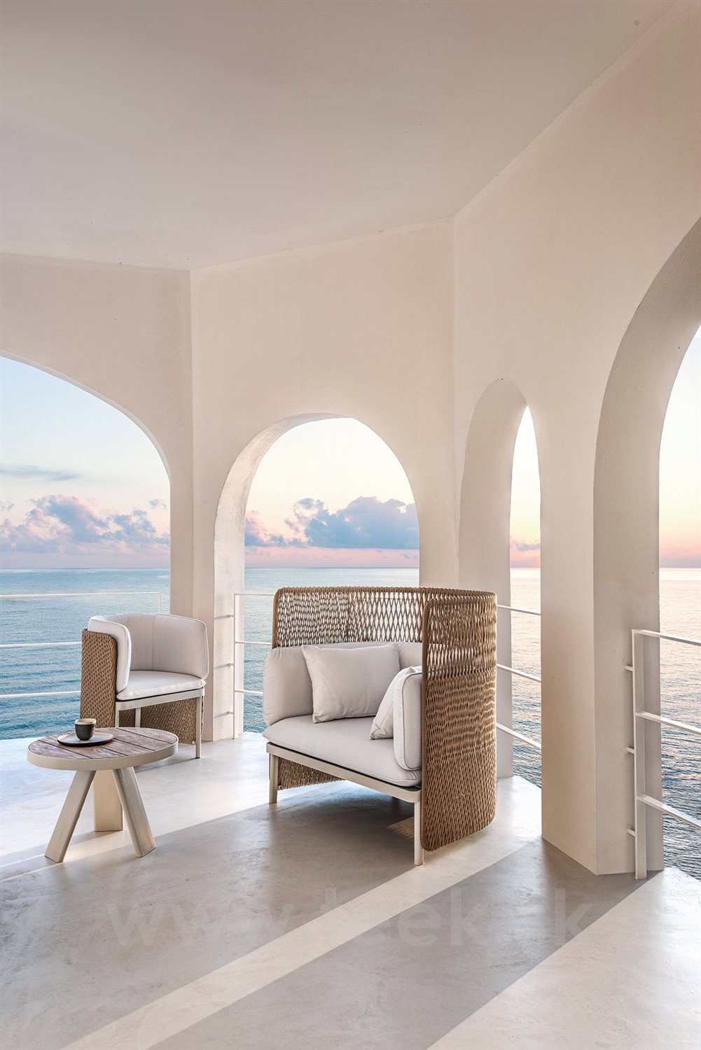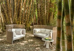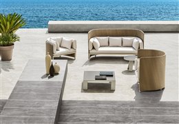 Kolekcia Esedra, inšpirovaná prvkami klasickej architektúry, je ikonou súčasného exteriéru. Kombinácia hliníka a teakového dreva s umelými vláknami obnovuje remeselný dojem a má teplo typické pre prírodné tkané vlákna, čoho výsledkom sú rafinované a príjemné riešenia, ktoré navodzujú pocit uvoľnenia a pohody.