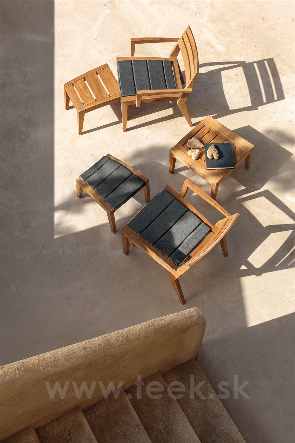 Kreslá, podnožka a bočný stolík z teakového dreva.