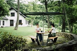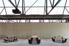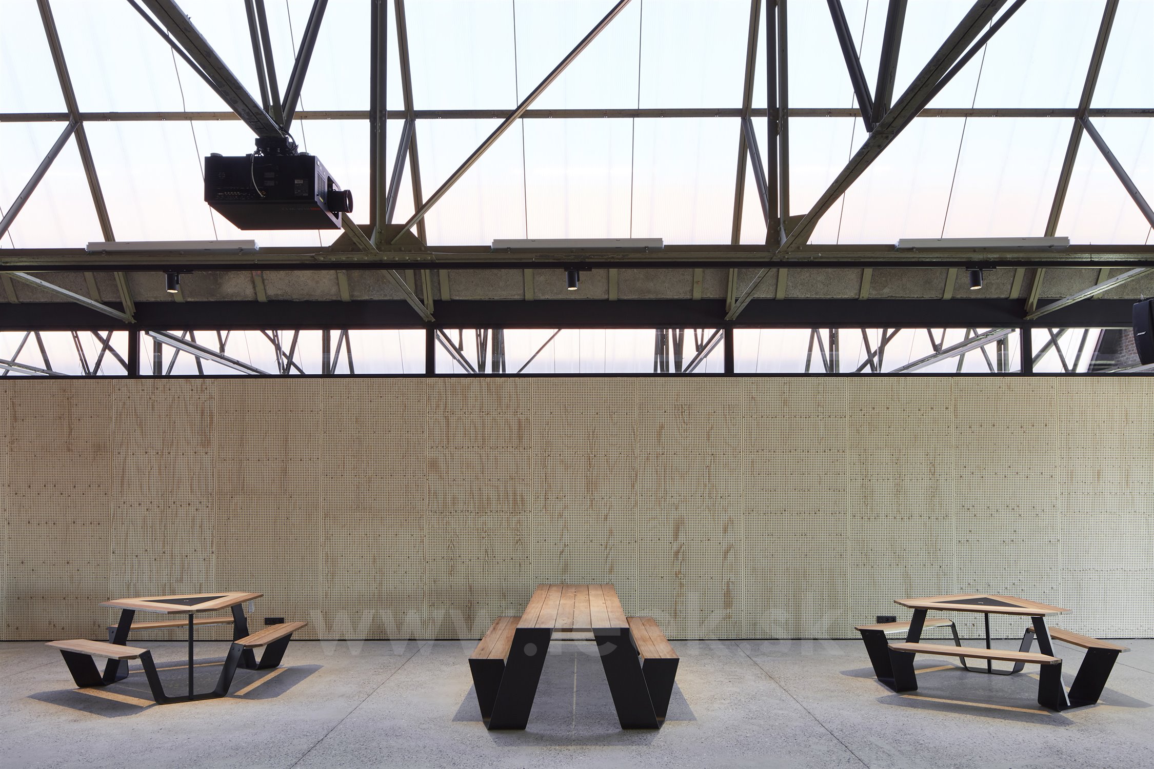 Jedálenský stôl Anker s integrovanou lavicou z troch strán od spoločnosti Extremis.
