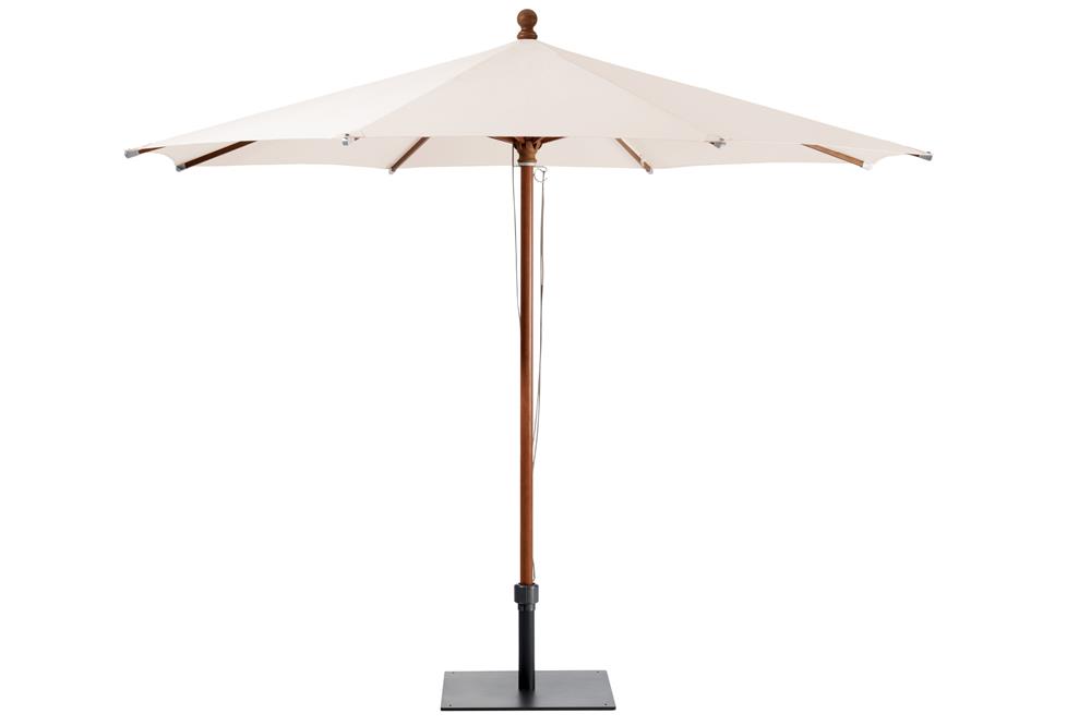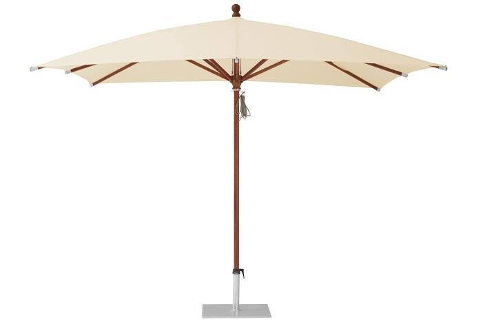 Drevený slnečník najvyššej kvality je k dispozícii v rozmeroch 300 cm a 350 cm (okrúhly) alebo 300x300 cm štvorcový. Ovláda sa pomocou lana, dodáva sa s kvalitným ochranným poťahom, poťah je na konci rebier vystužený kvalitnou kožou.