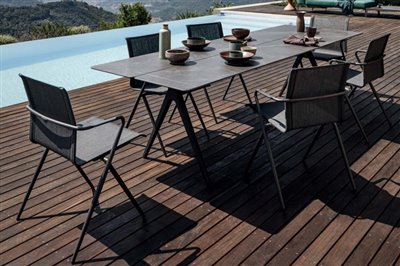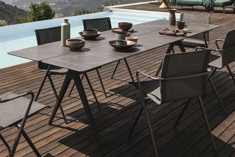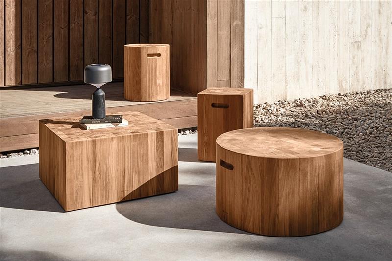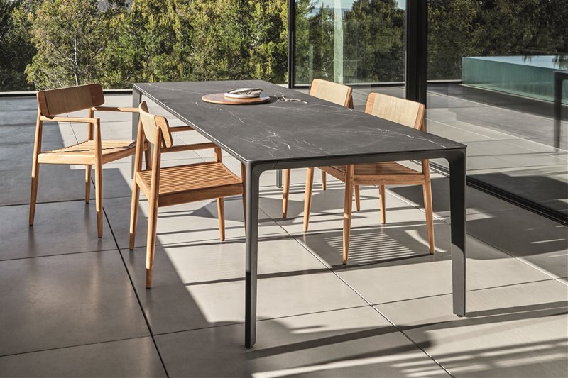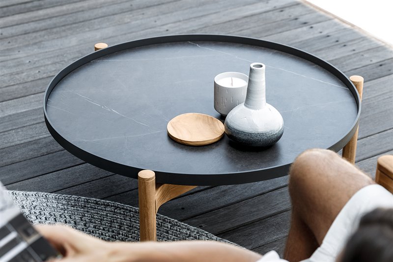Odkladacie a konferenčné stolíky s keramickou doskou a teakovým rámom.