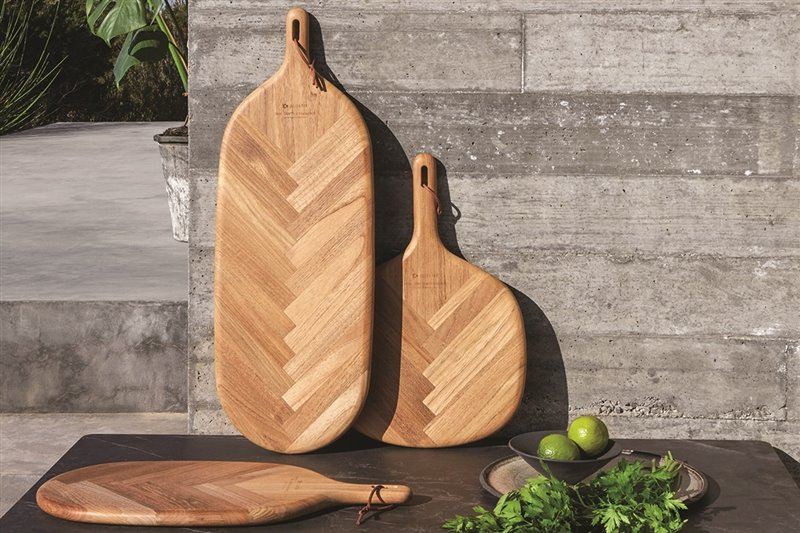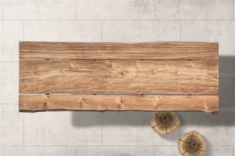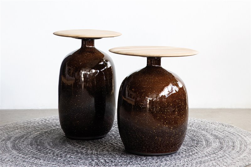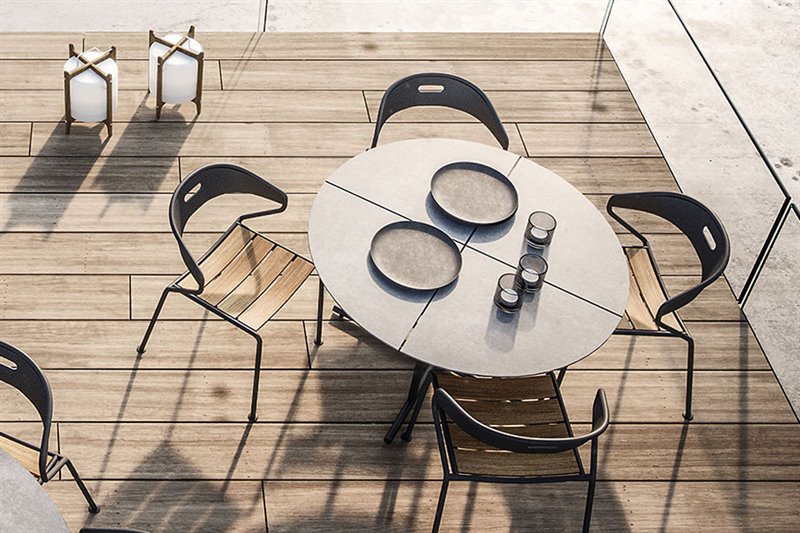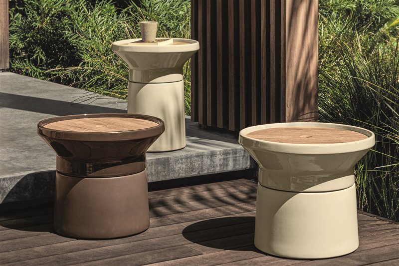 Stoly z glazovanej keramiky s vrchnou doskou z teakového dreva.