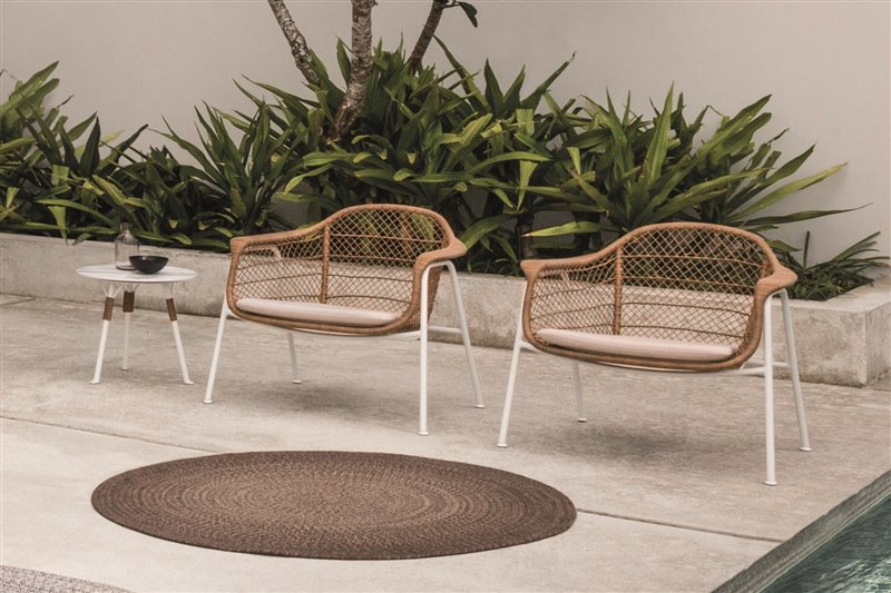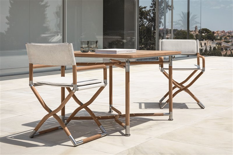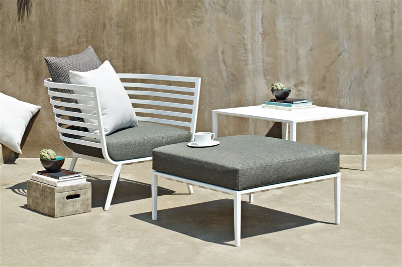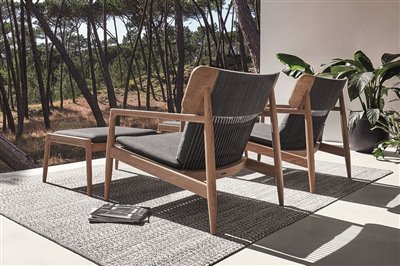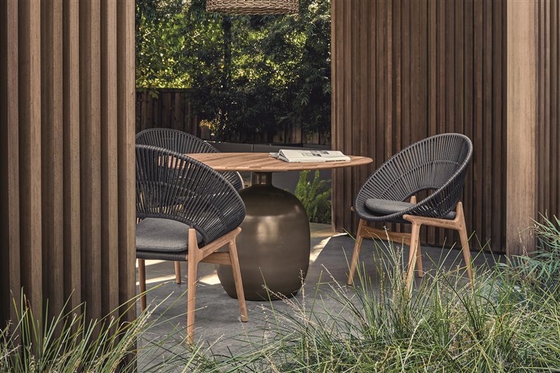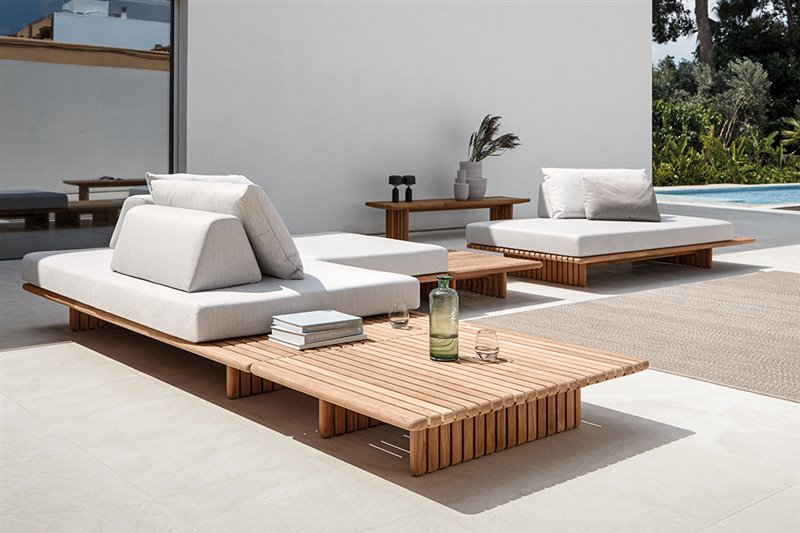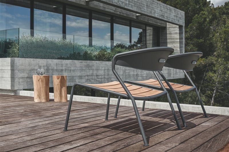 Nízke kreslá a konferenčné stolíky kombinujúce teakové drevo a lakovaný hliník.