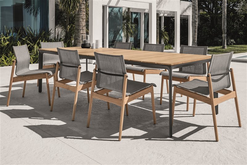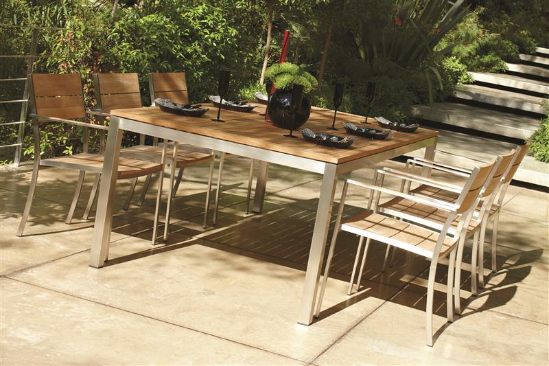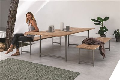 Záhradné jedálenské stoly s rámom z nehrdzavejúcej ocele a vrchnou doskou z teakového dreva.