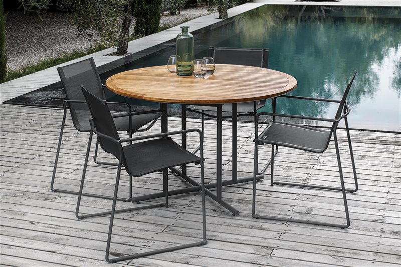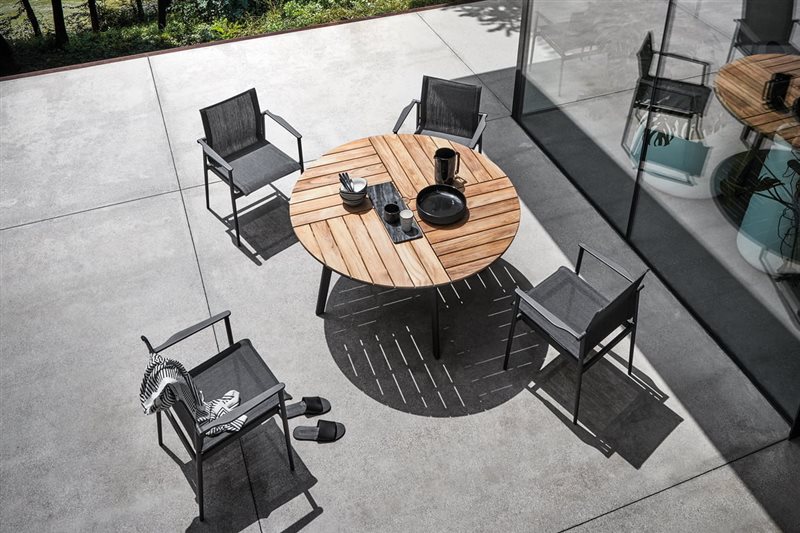 Jedinečné vonkajšie jedálenské stoly s pevnou 5 cm teakovou doskou.