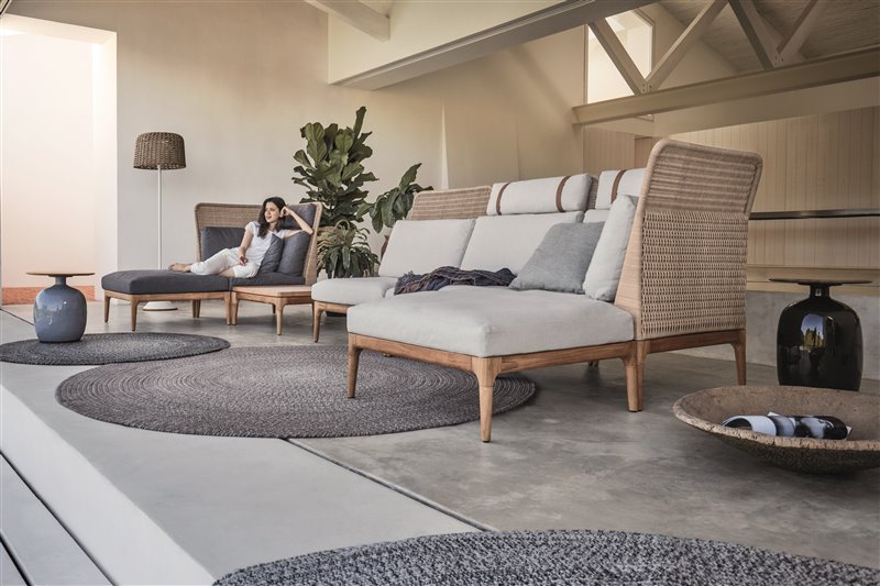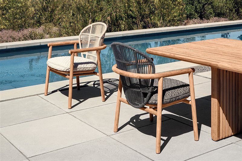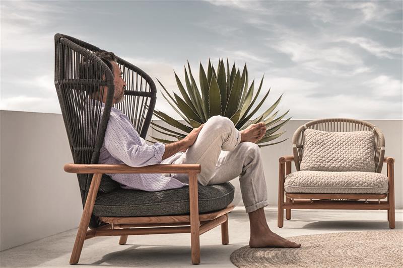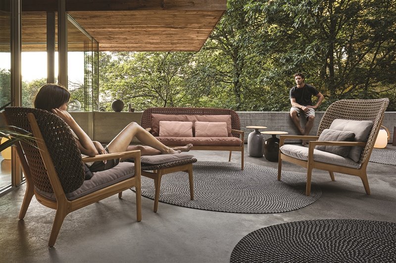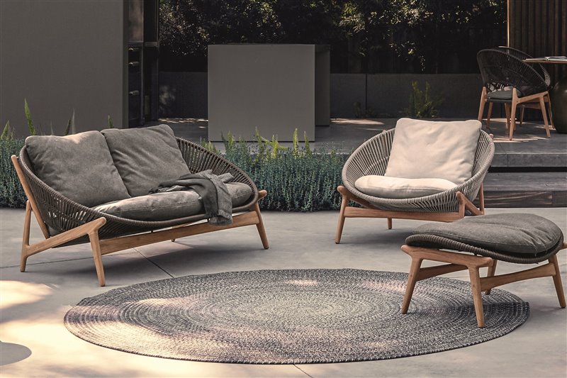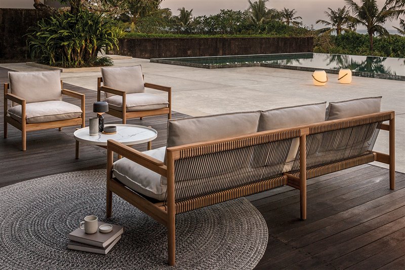 Štýlový teakový sedací nábytok s káblovým výpletom a sedacími vankúšmi na celoročné použitie.