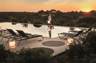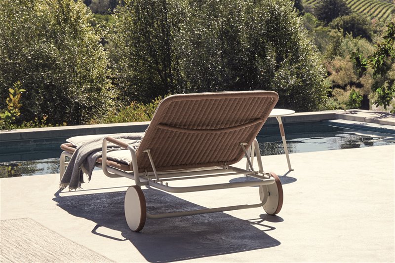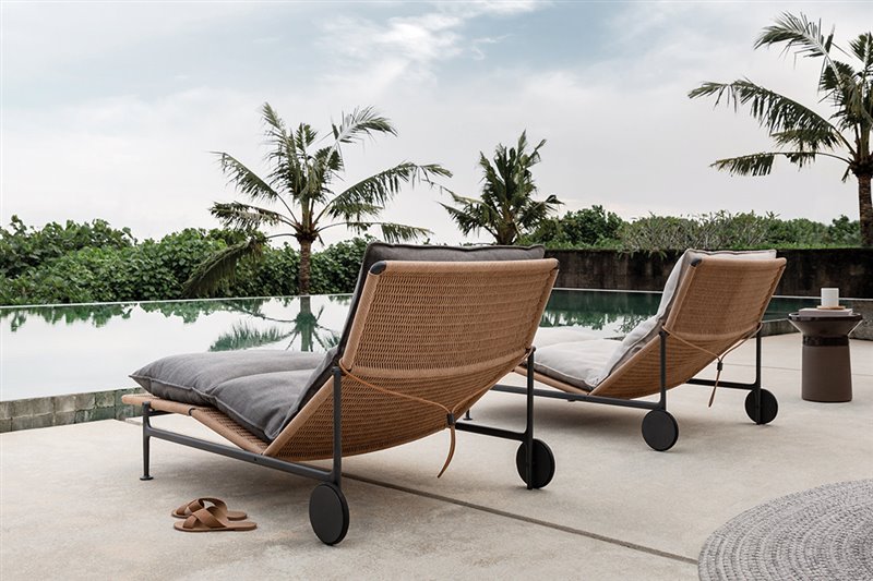 Navrhnuté relaxačné ležadlá z lakovaného hliníka a umelého ratanu.