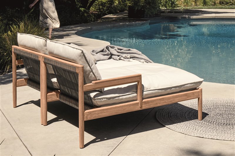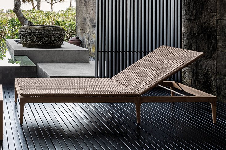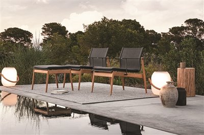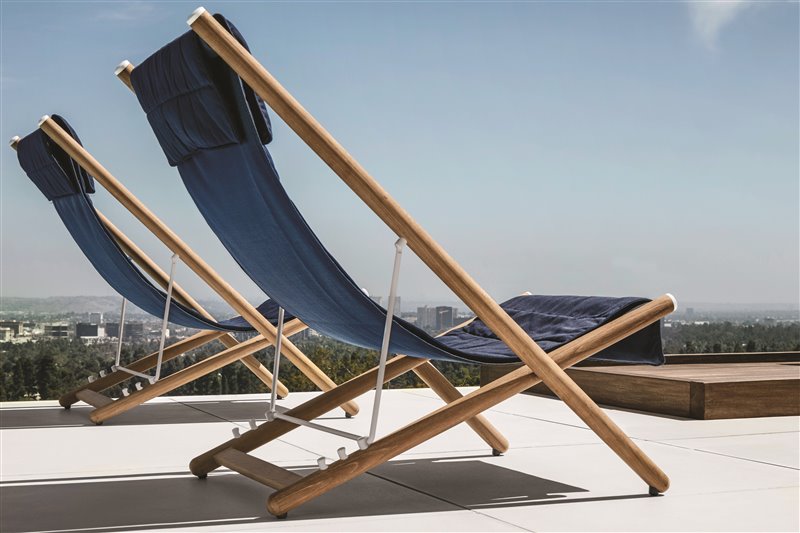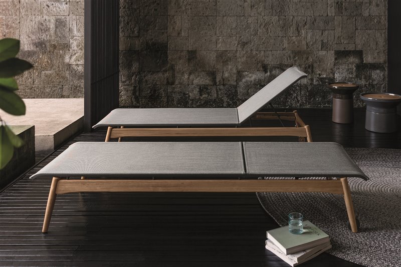 Vonkajšie lehátka z teakového dreva s textilným výpletom.
