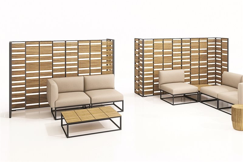 Záhradné zásteny z masívneho teakového dreva a lakovaného hliníka.