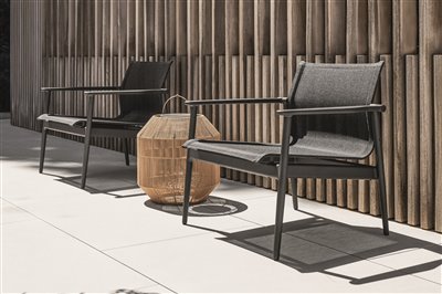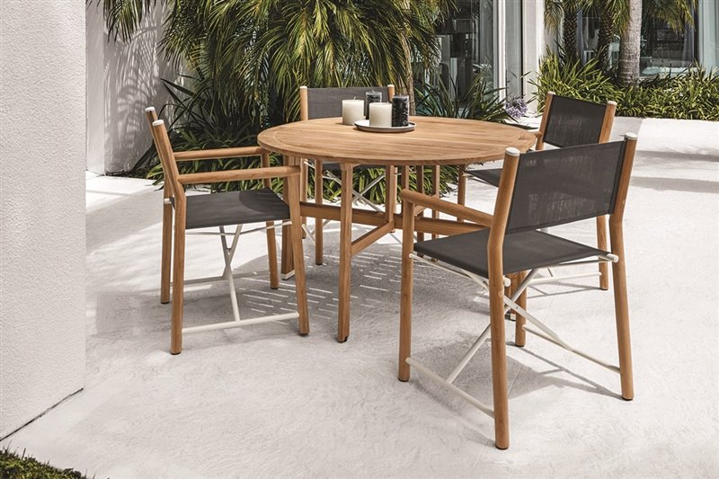 Záhradný nábytok na sedenie z masívneho teakového dreva a textilného výpletu.