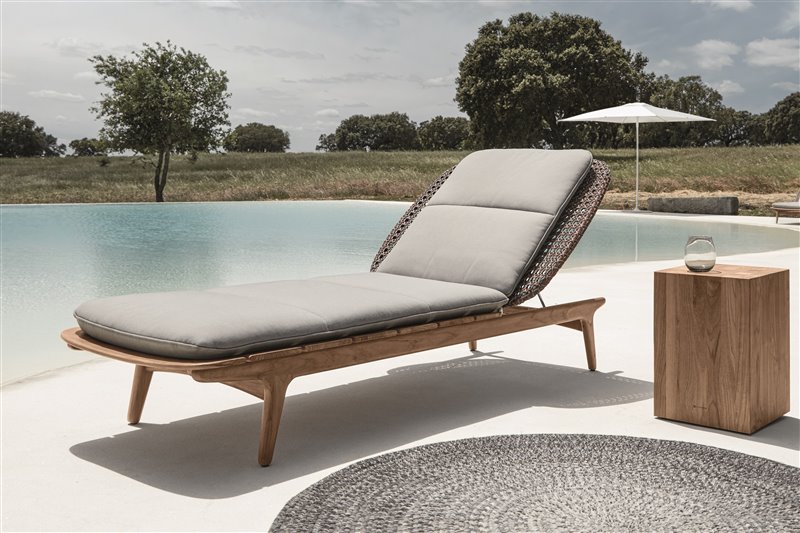 Dizajnové polohovateľné záhradné ležadlo z teakového dreva a umelého ratanu.