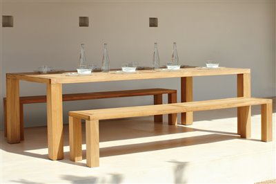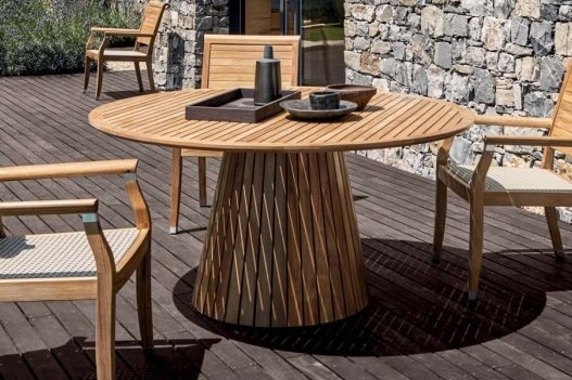 Jedálenské stoly z teakového dreva.