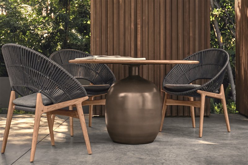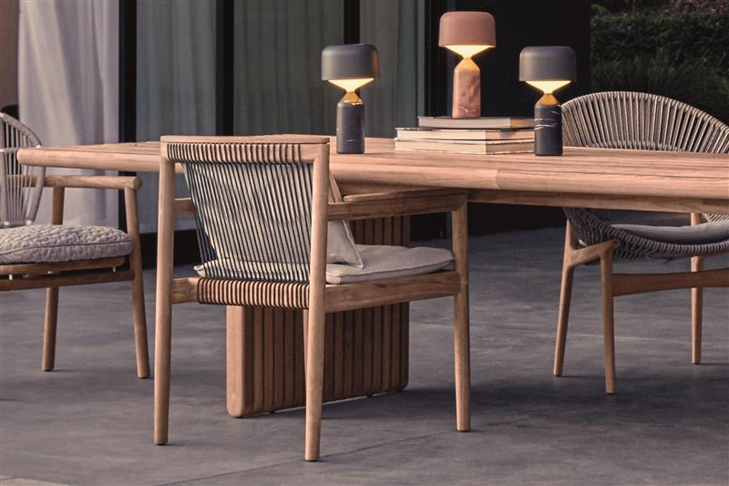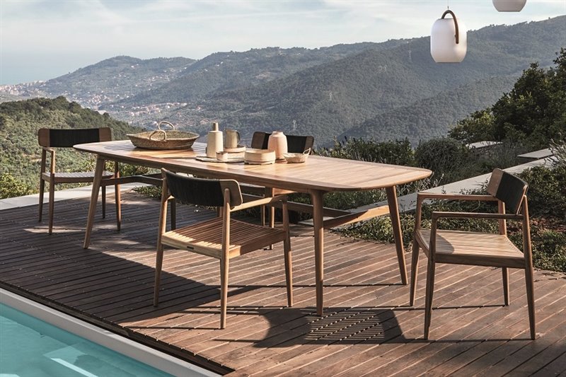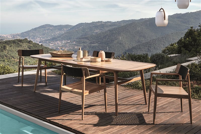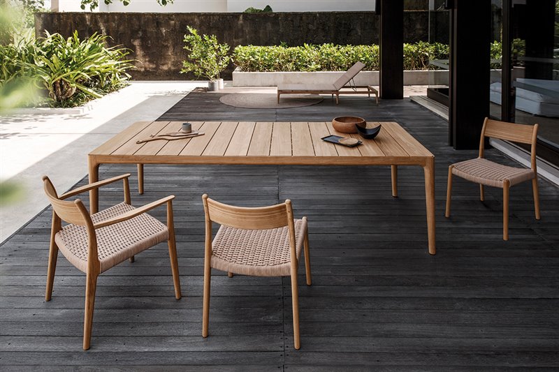 Dizajnový jedálenský nábytok z teakového dreva a umelého ratanu.