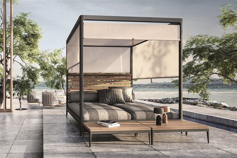 Veľká denná posteľ so strechou a veľkorysým priestorom na relaxáciu v stálej vonkajšej kvalite.