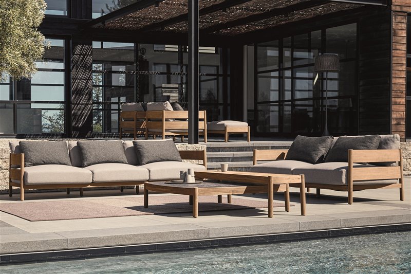 Dizajnová modulárna sedacia súprava z teakového dreva.