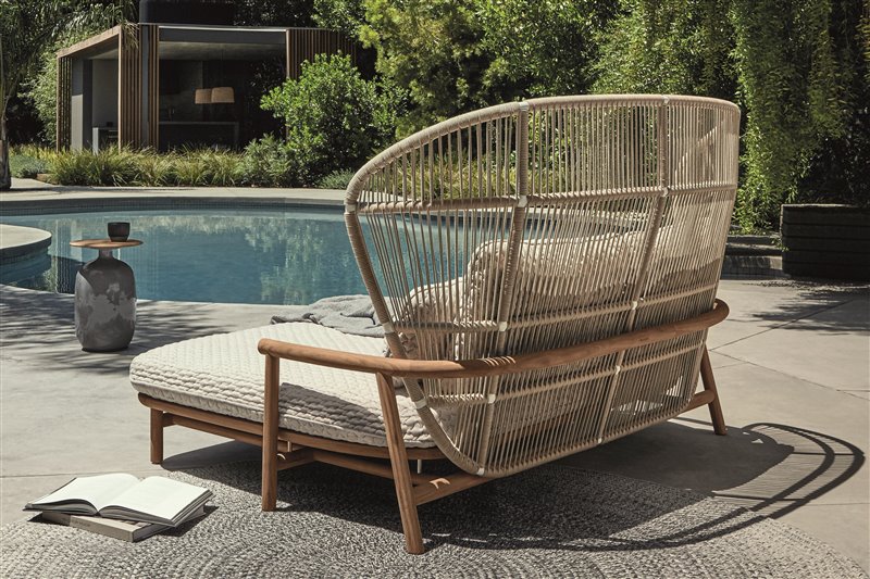 Dizajnový vzdušný vonkajší nábytok na ležanie s vysokým operadlom.