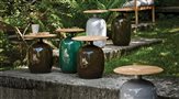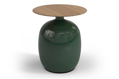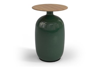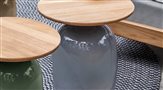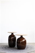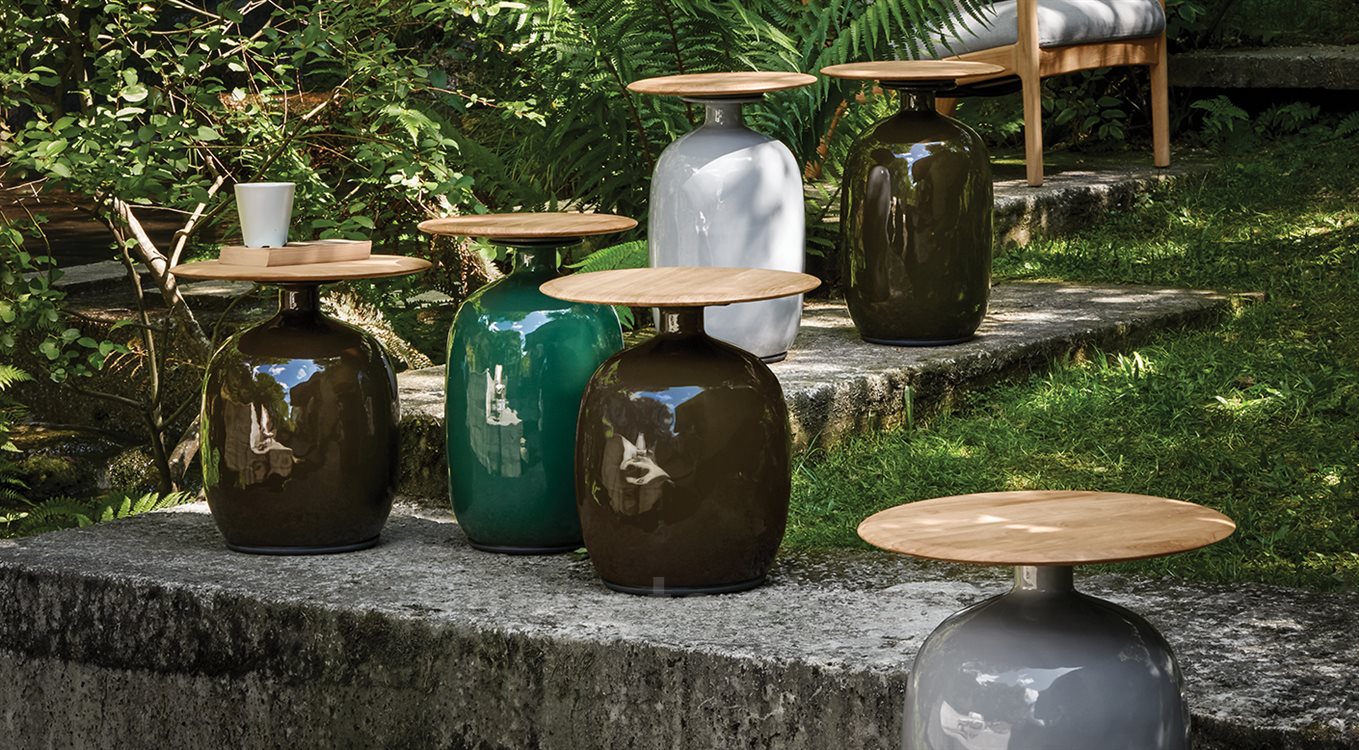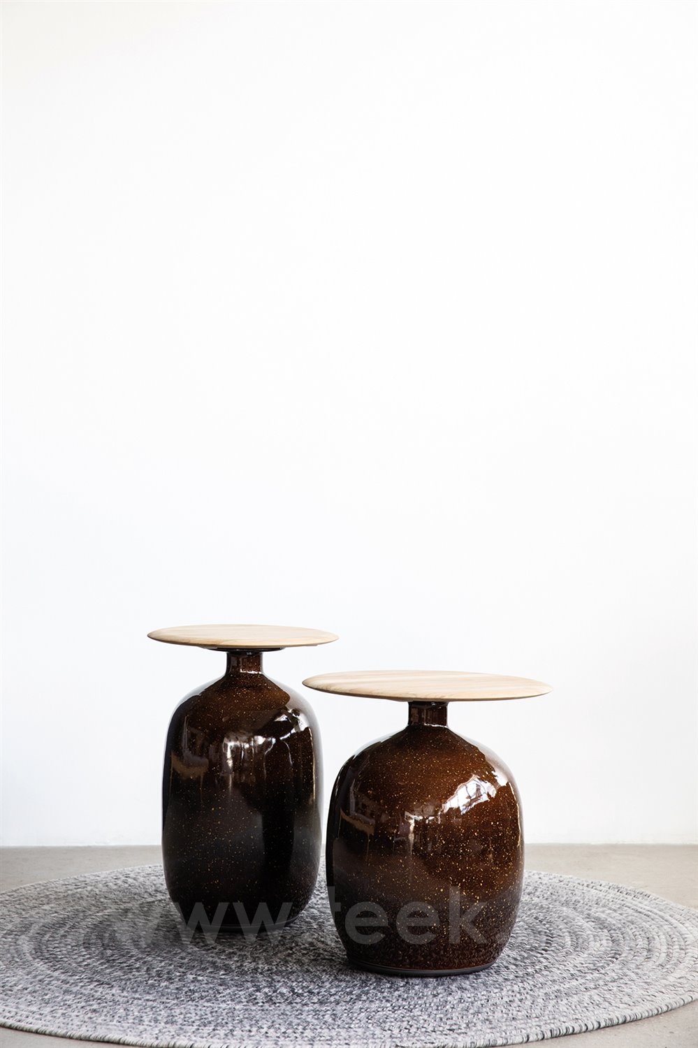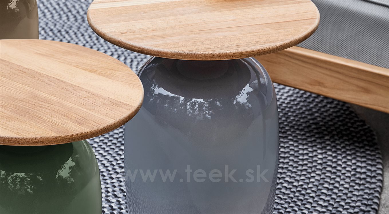 Glazované keramické odkladacie stolíky s vrchnou doskou z teakového dreva.