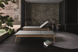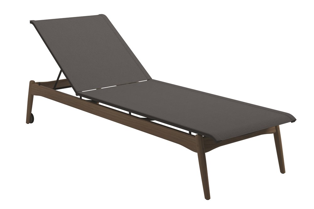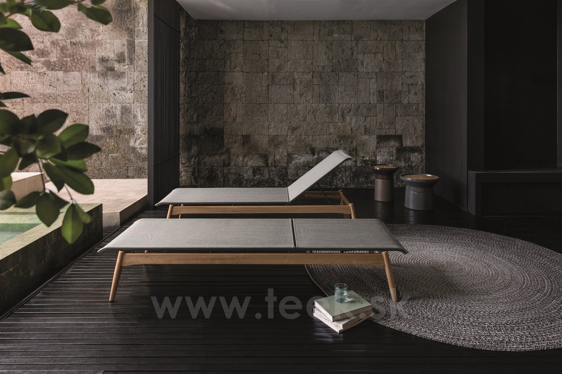 Vonkajšie lehátka z teakového dreva s textilným výpletom.
