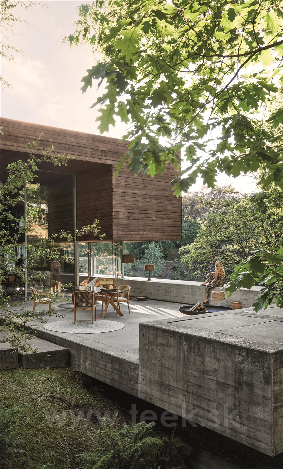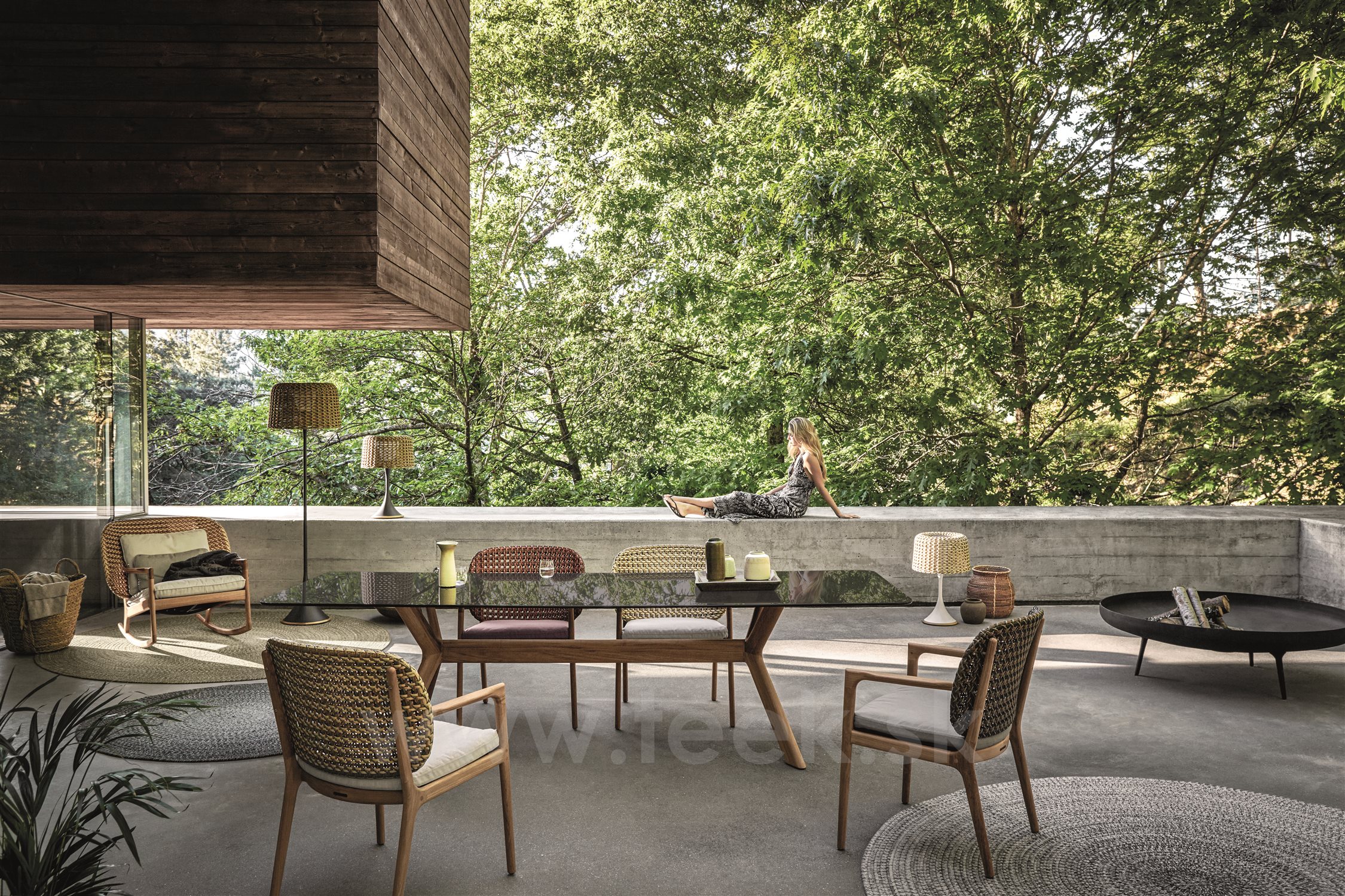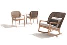 Dizajnová vonkajšia jedálenská stolička z teakového dreva a umelého ratanu.