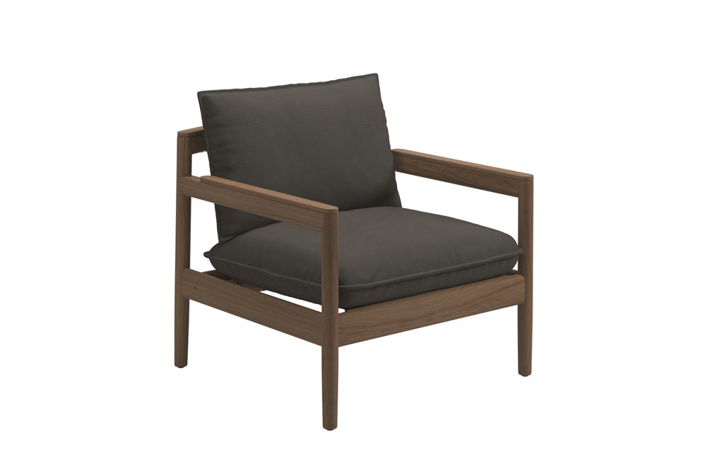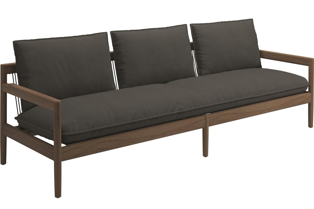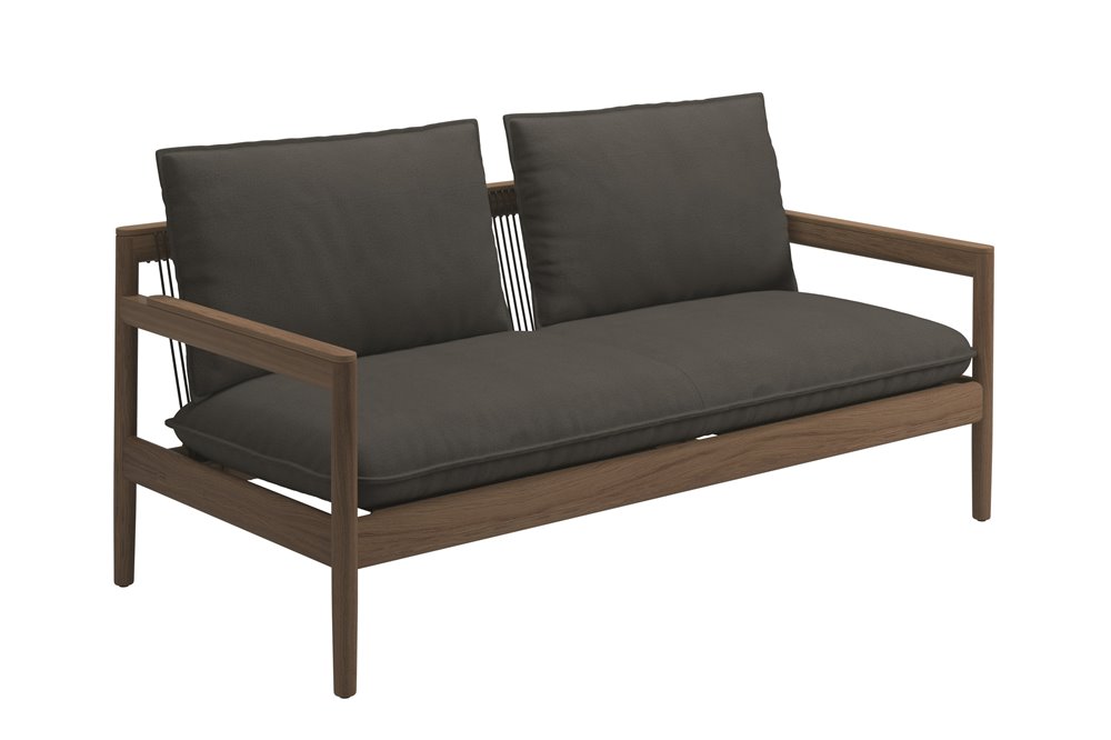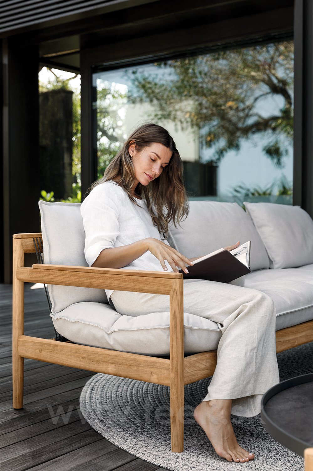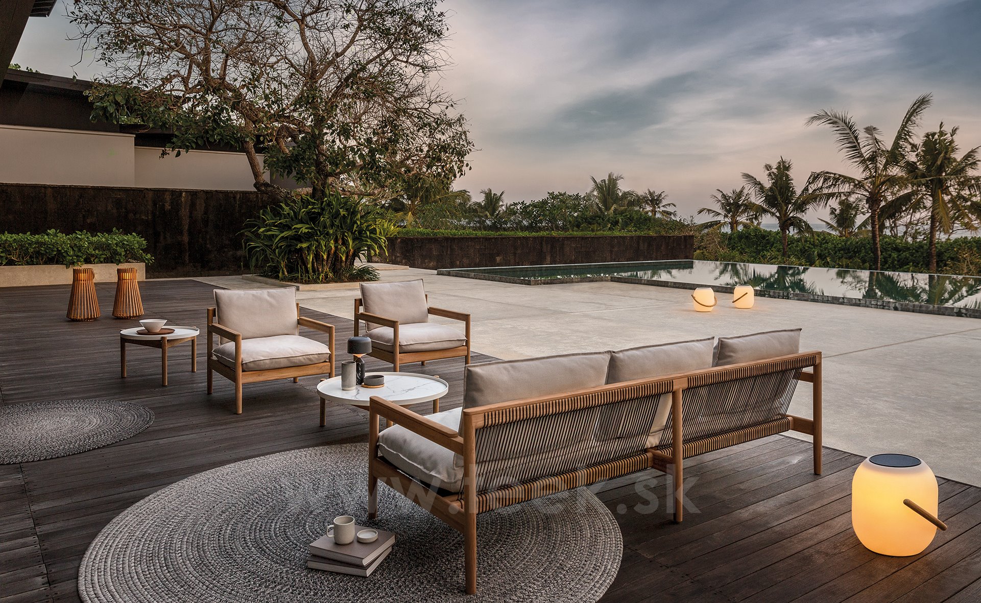 Vonkajší nábytok z masívneho teakového dreva Saranac od spoločnosti Gloster. Kolekcia Saranac kombinuje masívne teakové drevo s káblovým výpletom a vankúšmi z vonkajšej tkaniny, ktoré sú veľmi odolné, ľahko sa čistia a rýchlo schnú. Kolekcia Saranac je určená na celoročné používanie.