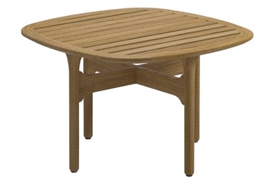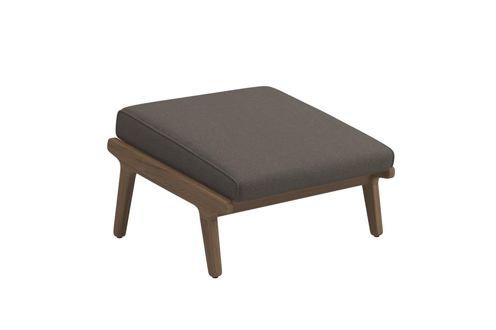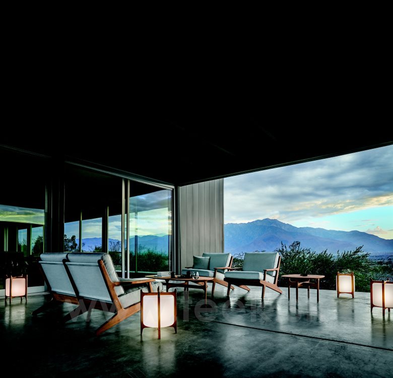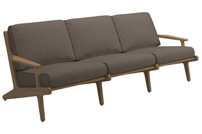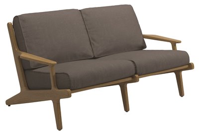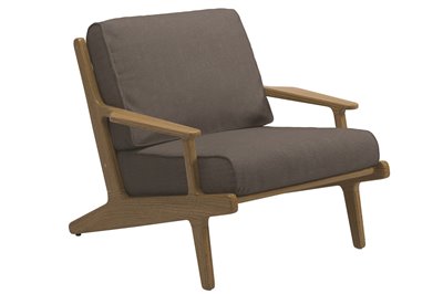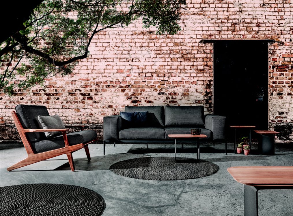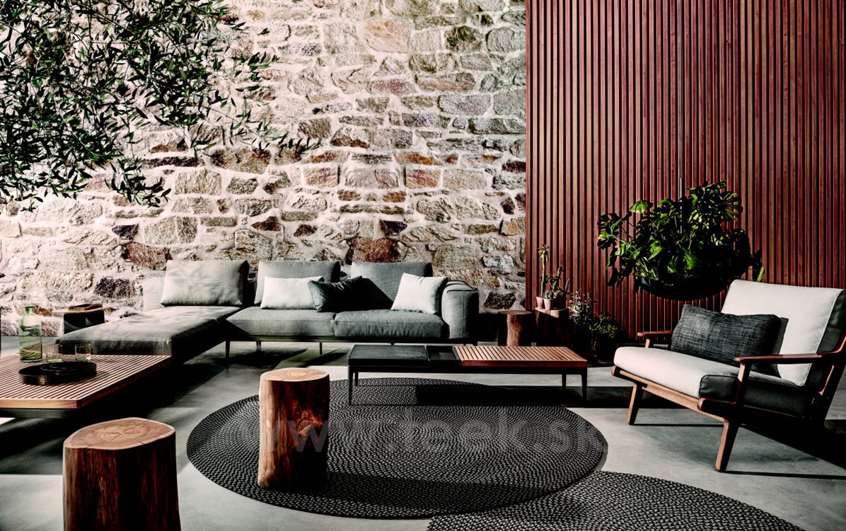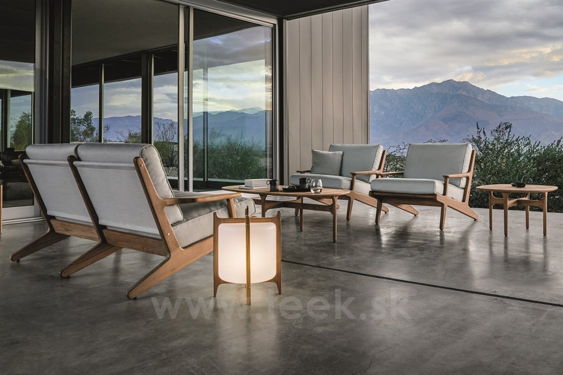 Vonkajší nábytok z masívneho teakového dreva Bay by Gloster. Kolekcia Bay kombinuje masívne teakové drevo s vonkajšími textilnými vankúšmi, ktoré sú veľmi odolné, ľahko sa čistia a rýchlo schnú.