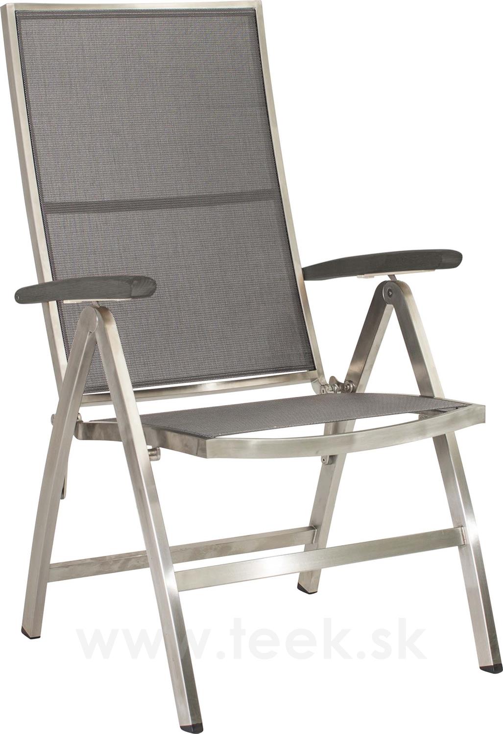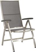 Stainless steel dining armchair with aluminium arms Cardiff by Stern. The garden dining chair has a stainless steel construction, fabric upholstery and aluminium armrests. The chair is reclining in 5 positions and foldable.