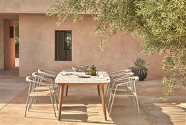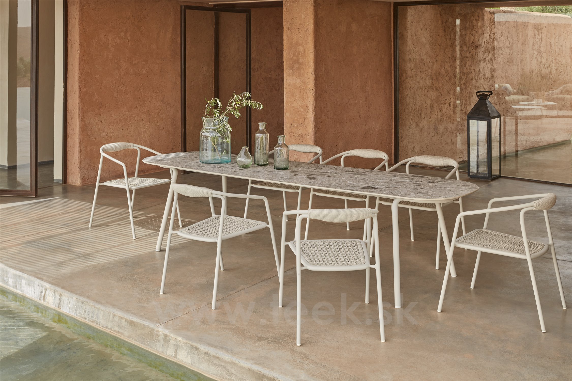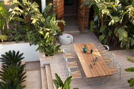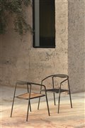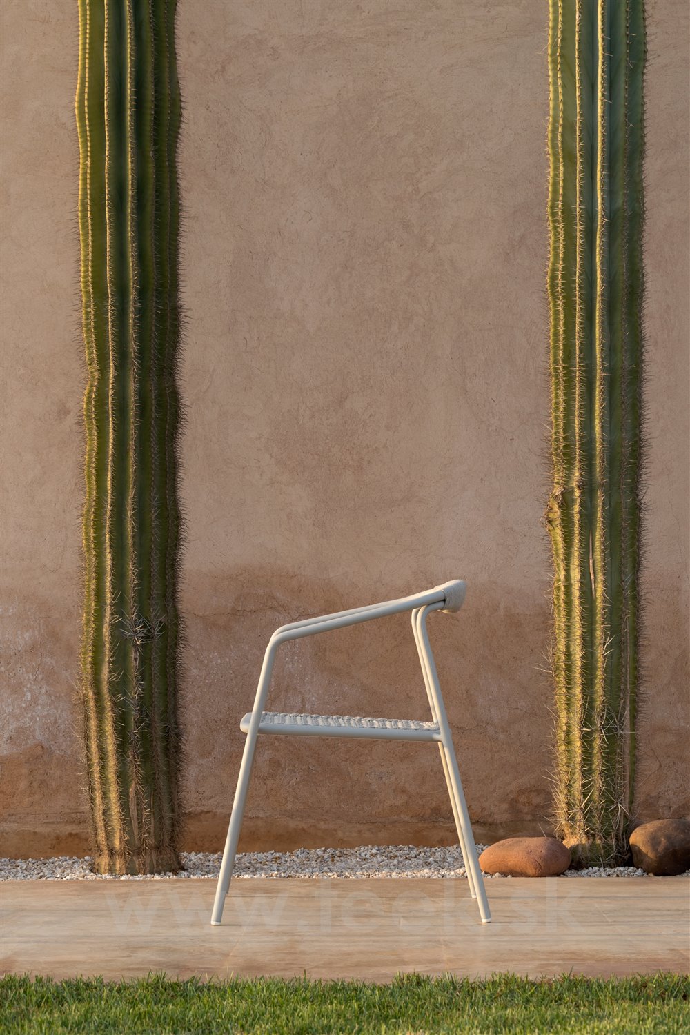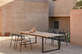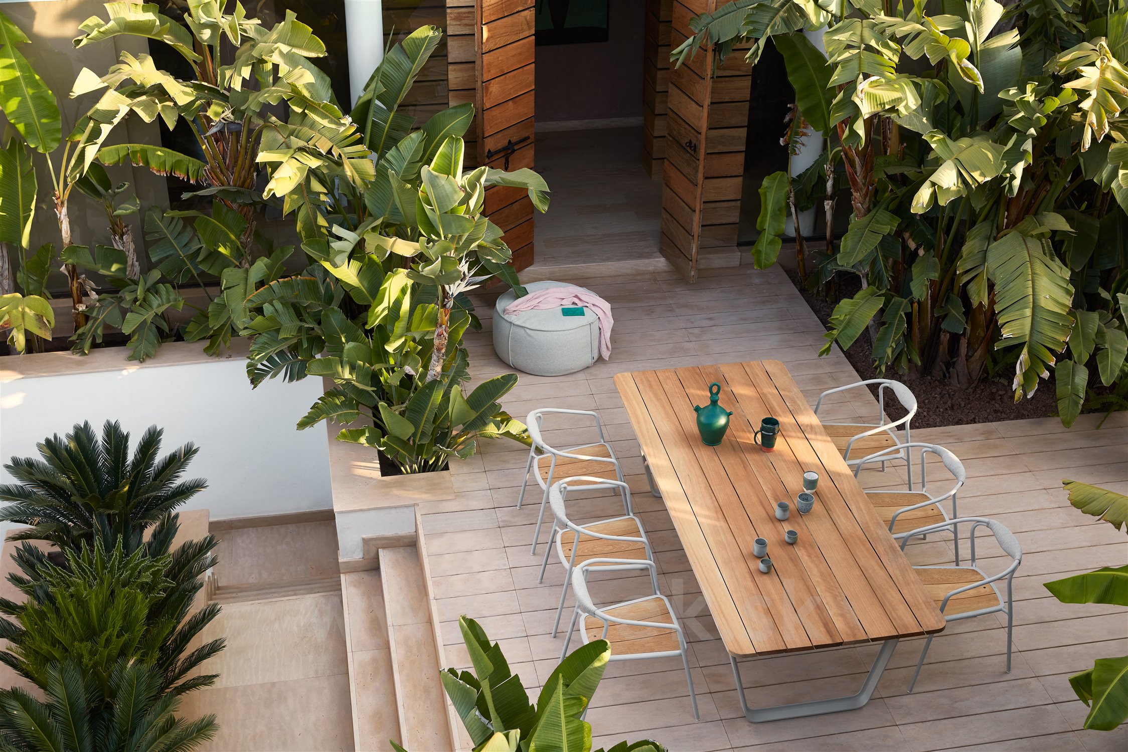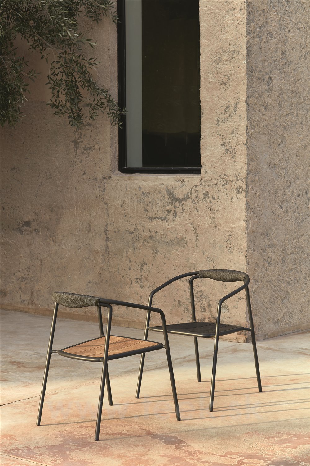 Kolekcia dizajnových záhradných stoličiek Duo od spoločnosti Manutti. Konštrukcia je vyrobená z lakovaného hliníka a sedadlo je z masívneho teakového dreva. Sortiment zahŕňa jedálenskú záhradnú stoličku a hojdacie kreslo.