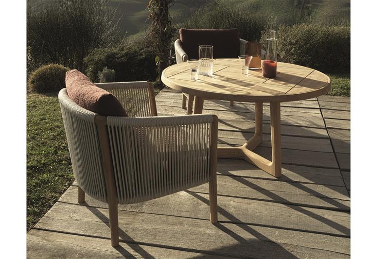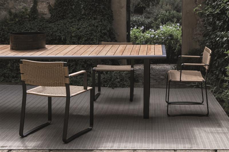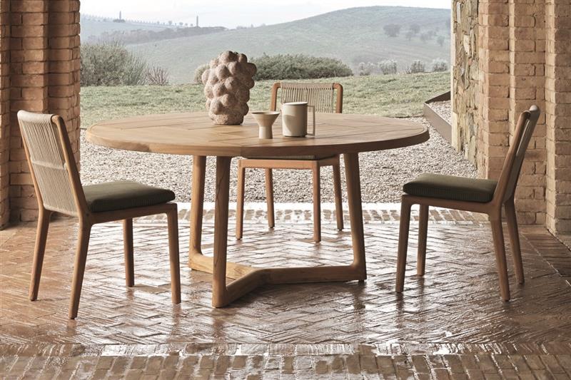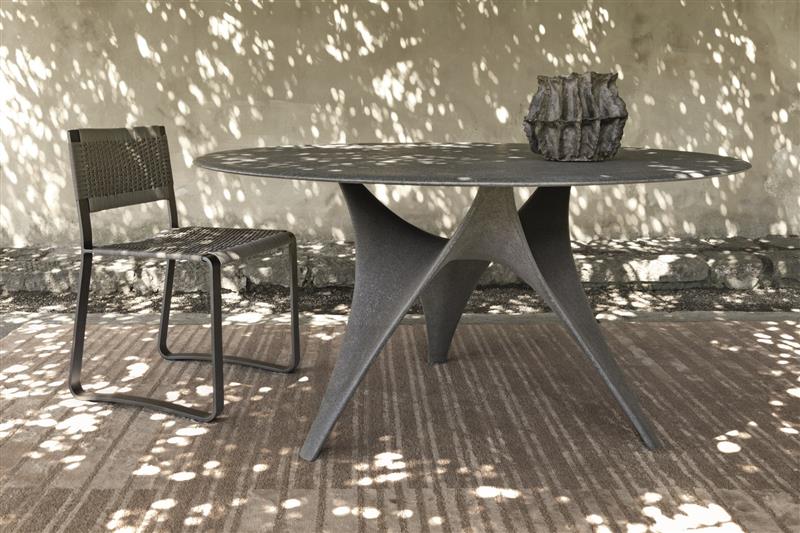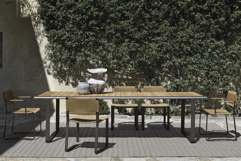 Dizajnové jedálenské stoly s doskou z lávového kameňa alebo teakového dreva.