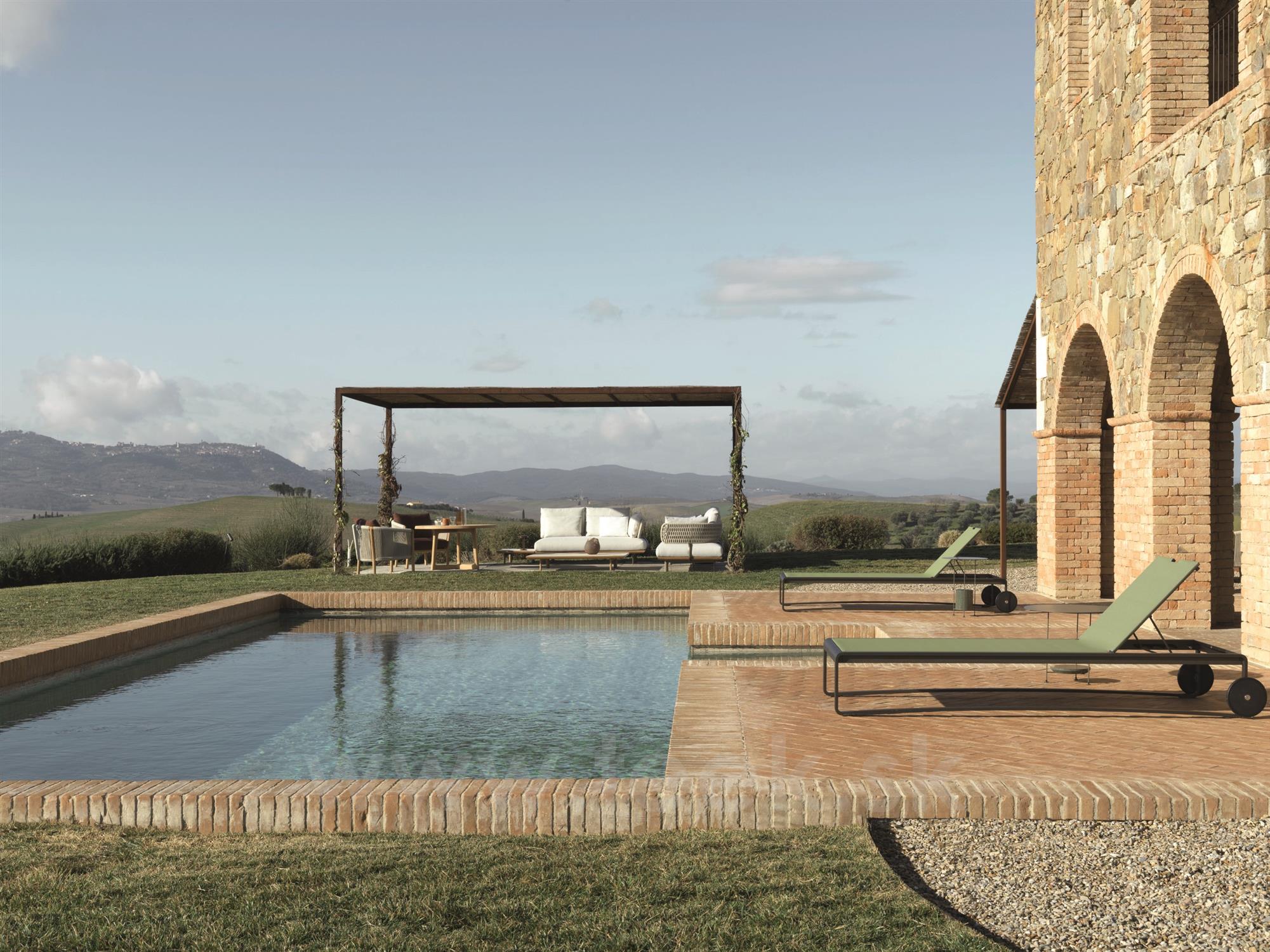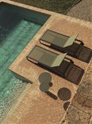 Guell ležadlo z kolekcie Timeout kombinuje lakovaný hliník a ručne tkané polypropylénové pásky s možnosťou vyhotovenia z masívneho teaku alebo nového materiálu Batyline. Nastaviteľná opierka a koliesko pre jednoduchú manipuláciu zabezpečujú pohodlie aj praktickosť, zatiaľ čo jemné proporčné detaily odrážajú charakter celej kolekcie.