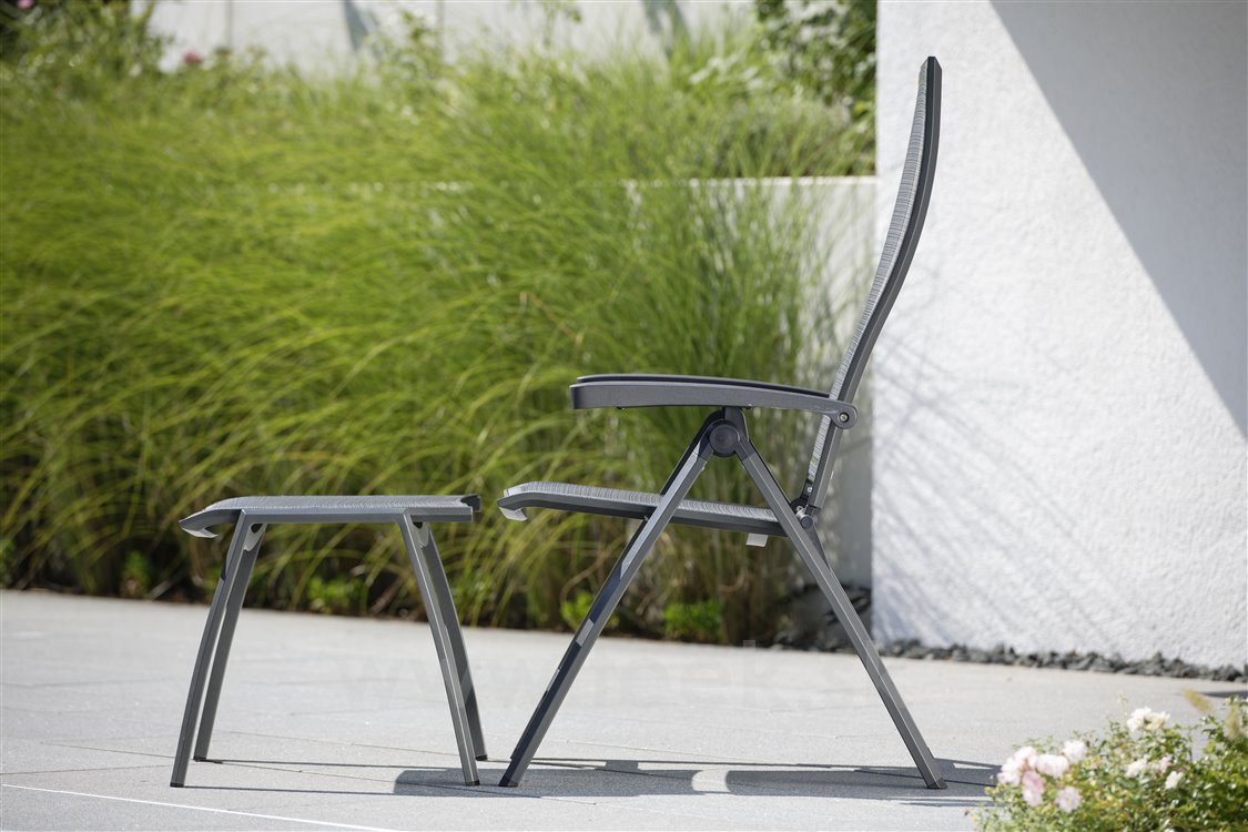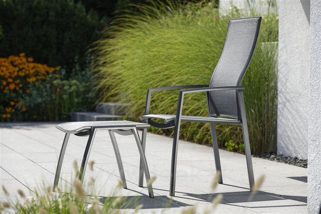 Záhradný otoman Kari od spoločnosti Stern. Podnožka má hliníkovú konštrukciu a je vyrobená z pohodlného a pružného textilu.
