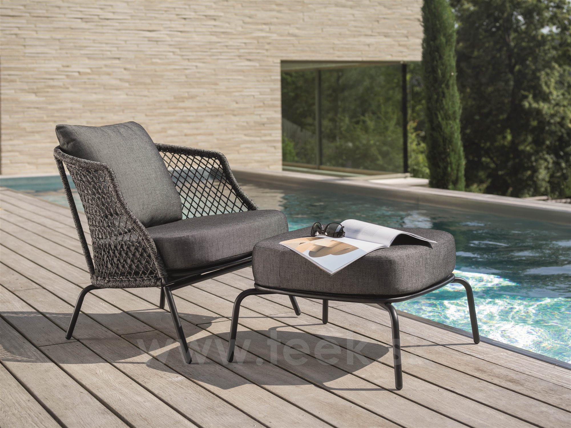 Vonkajšia podnožka Odea od spoločnosti Stern. Rám záhradnej podnožky je vyrobený z lakovaného hliníka. Sedadlo je vyrobené z vonkajšej tkaniny. Výplň sedadla je vyrobená z rýchloschnúcej peny, a preto ju nie je potrebné chrániť pred dažďom.