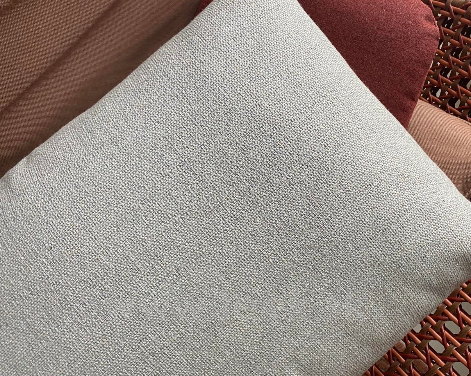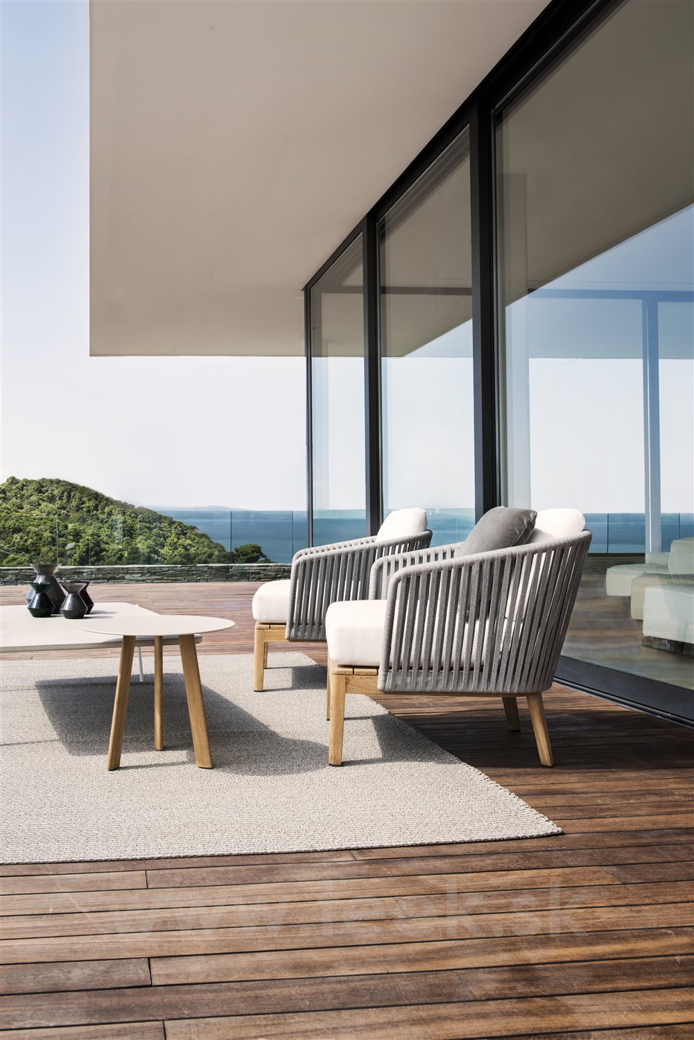 Nízka vonkajšia stolička Mood značky Tribu z tíkového dreva so širokým lanovým výpletom vo svetlosivej farbe (neaktuálna farba pre aktuálnu sezónu) vrátane vonkajšieho sedáku a opierkového vankúša v sivomodra farbe (Revive Jaspe).