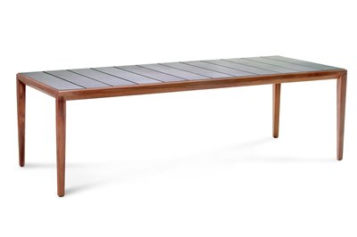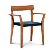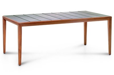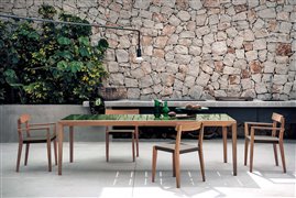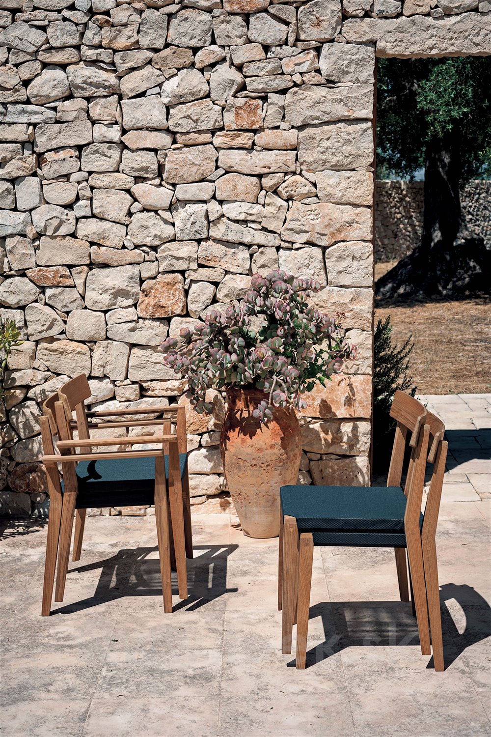 Jídelní zahradní křeslo Teka značky Roda. Konstrukce křesla je z masivního teakového dřeva a výplet z textilenu (Canatex). Zahradní křeslo je stohovatelné.