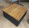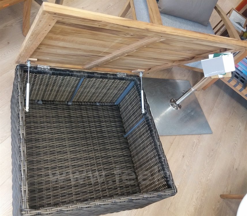 Zahradní stolek Rimini značky Persoon má konstrukci z umělého ratanu a výklopnou desku z teakového dřeva. Desku stolku lze otevřít (plynová vzpěra).