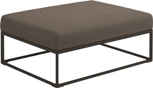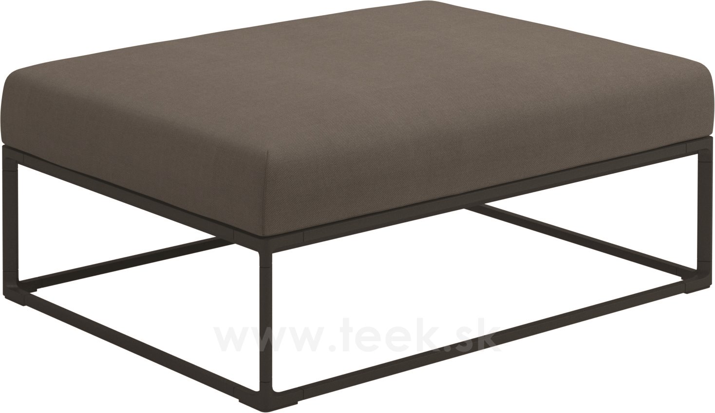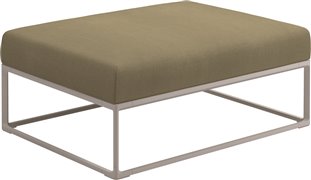 Podnožka Maya od spoločnosti Gloster. Rám podnožky je vyrobený z lakovaného hliníka, čalúnenie je z vonkajších odolných tkanín. Výplne sú vyrobené z rýchloschnúcej peny, takže podnožka môže byť vonku po celý rok.