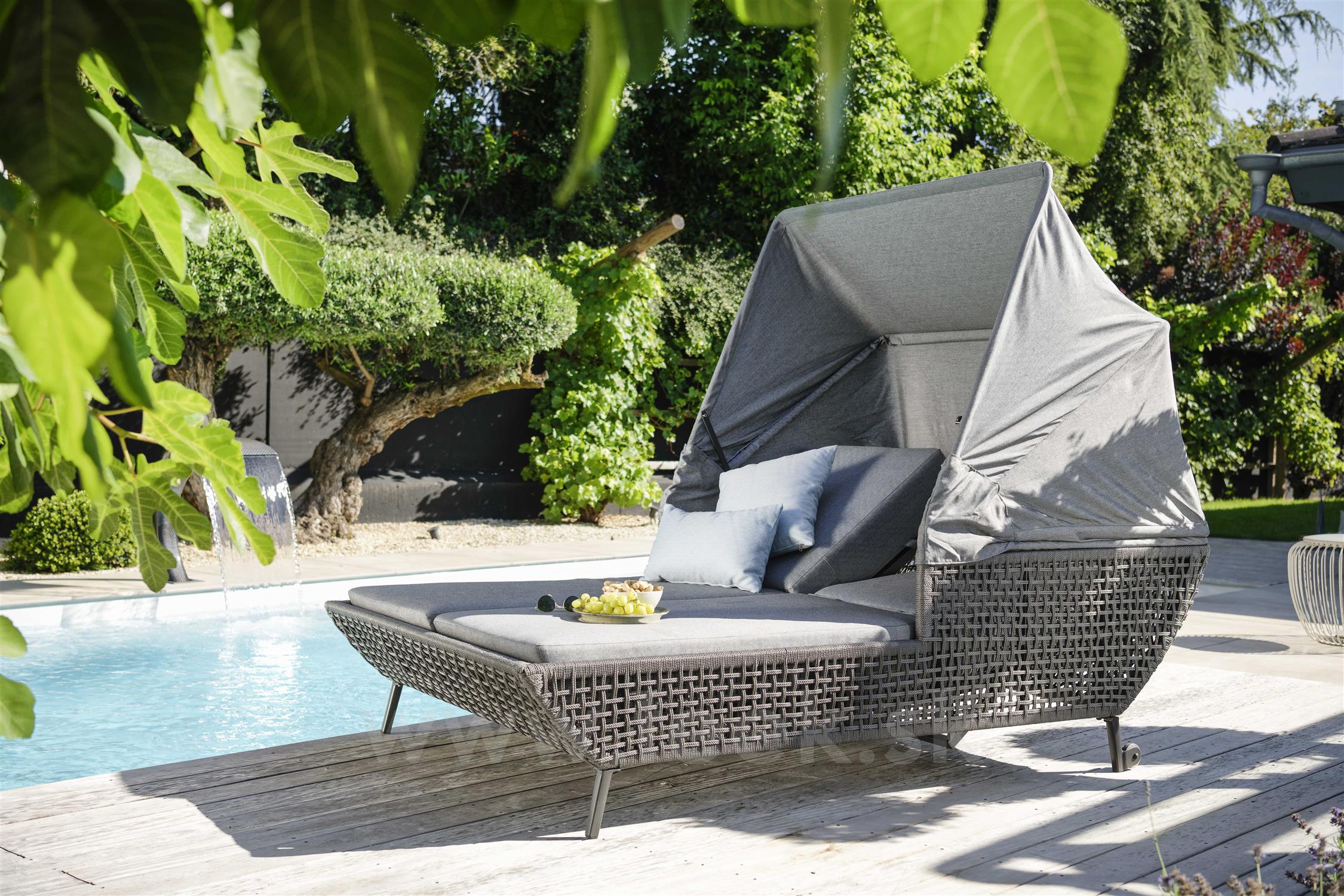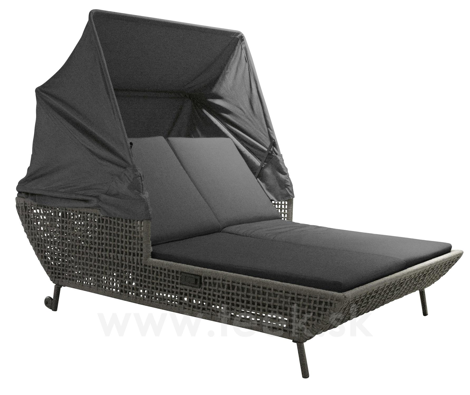 Vonkajšia posteľ Greta s polohovateľnými matracmi a strechou.