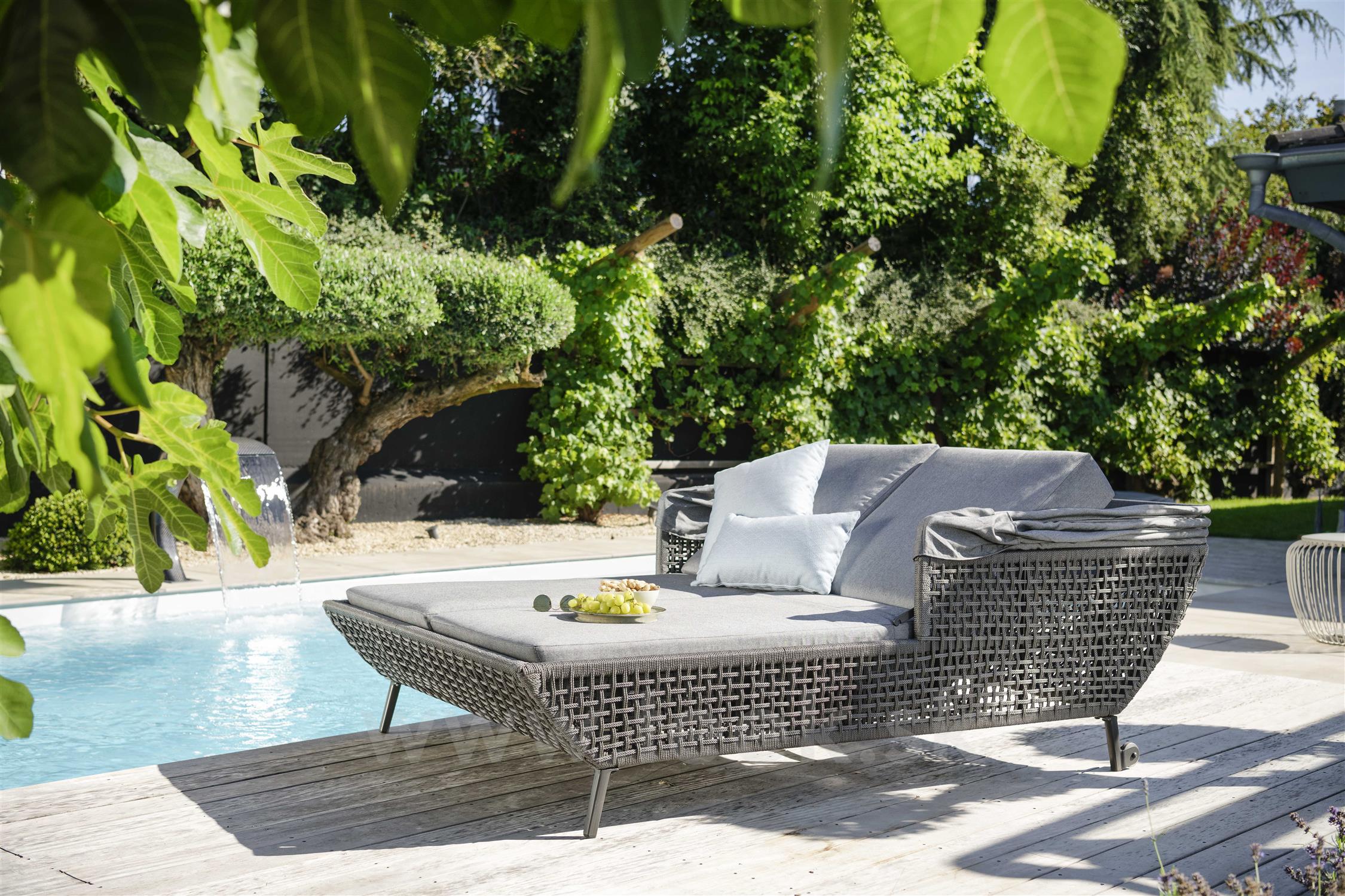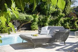 Ležadlo so strieškou a kolieskami Greta, Stern, 221x140x173 cm, polohovateľné operadlo, rám lakovaný hliníkovou farbou sivo-čiernej farby (antracit), výplet káblov sivej farby (platina), matrac z bežnej peny, poťah 100% polyakryl sivej farby