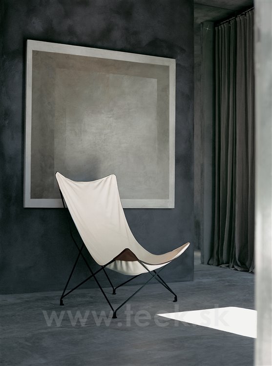 Kolekcia Lawrence od spoločnosti Roda ponúka nízke relaxačné kreslo s oceľovou konštrukciou a plátenným čalúnením s koženými výstuhami a podnožkou. Všetko je skladacie.