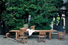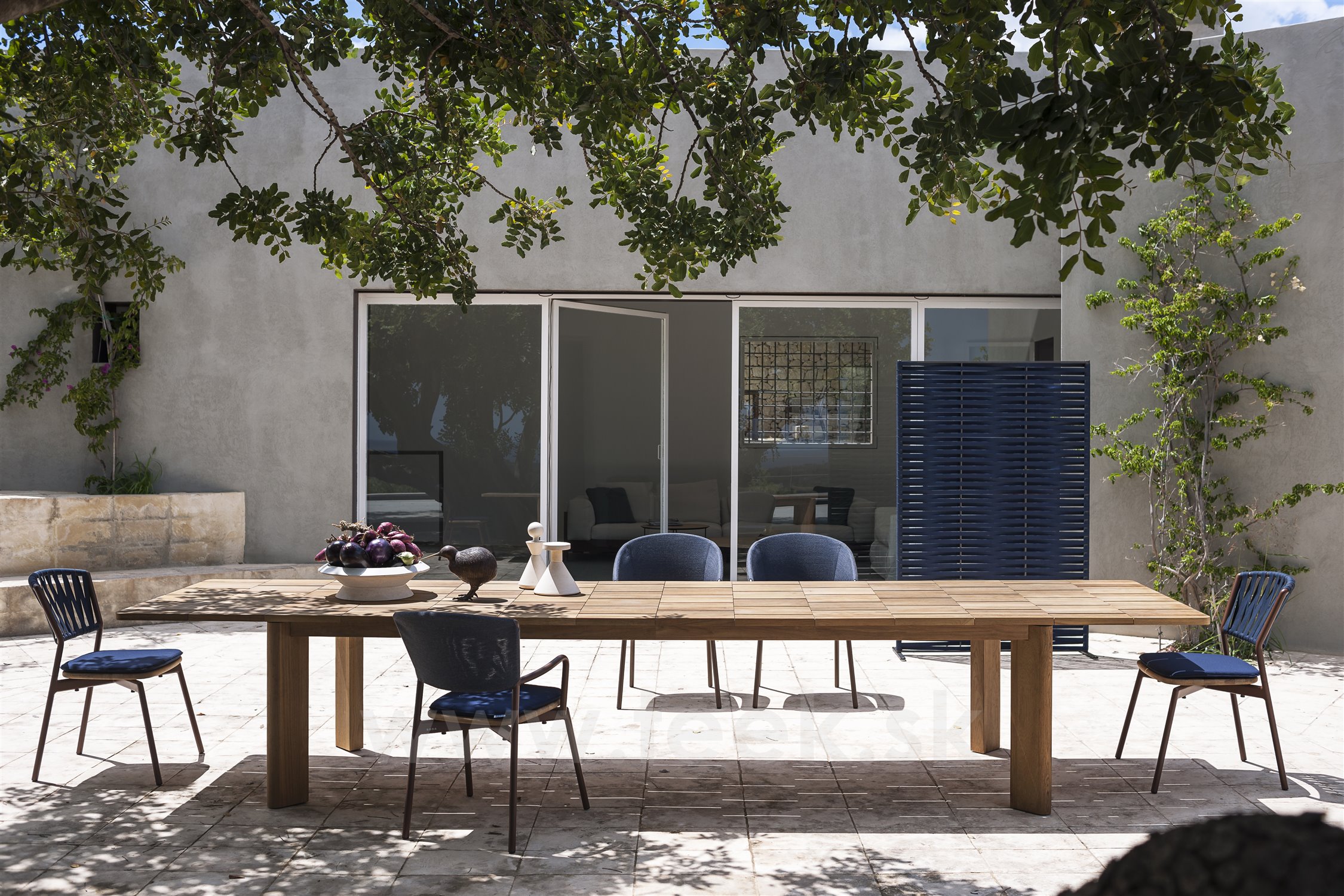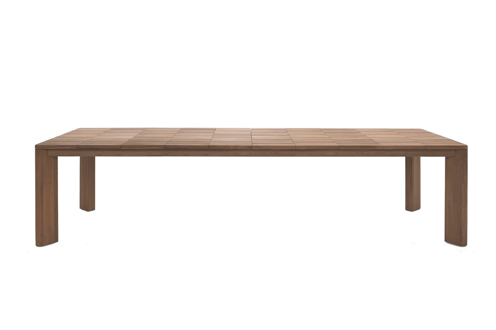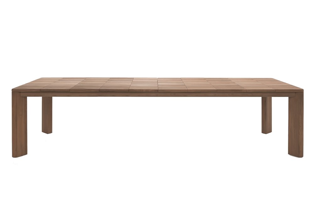 Kolekcia záhradných jedálenských stolov Brick z teakového dreva od spoločnosti Roda. Kolekcia obsahuje jedálenské stoly v dvoch tvaroch. Rozkladací jedálenský stôl je celý z teakového dreva, okrúhly jedálenský stôl kombinuje teakové drevo a kameň.