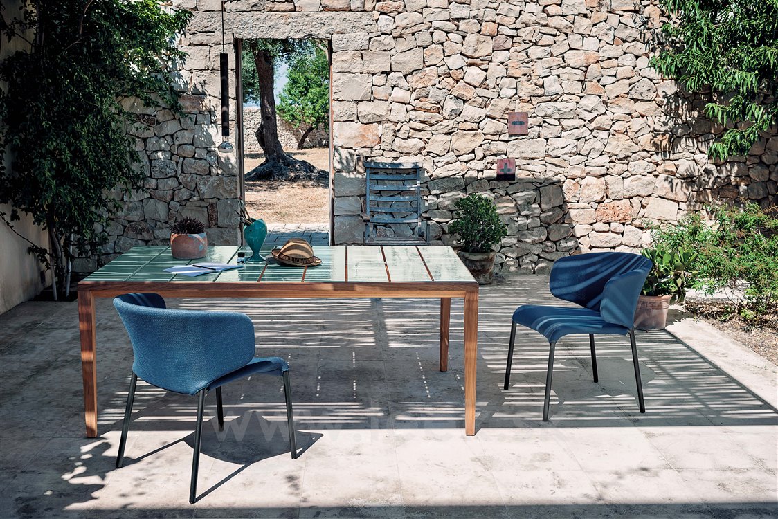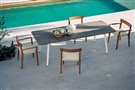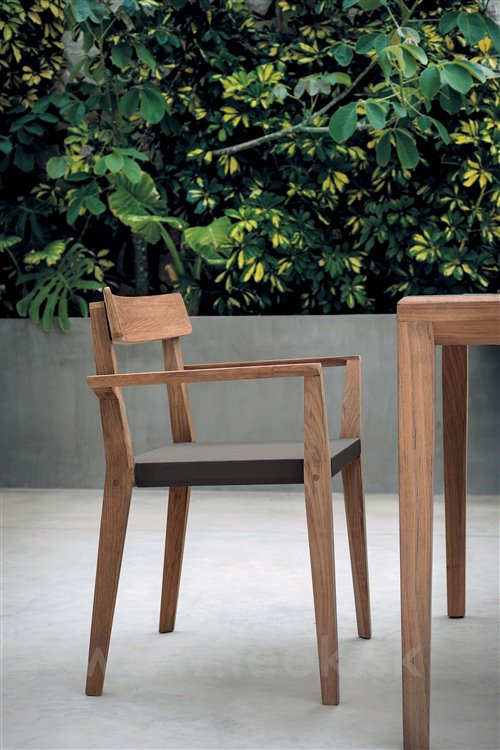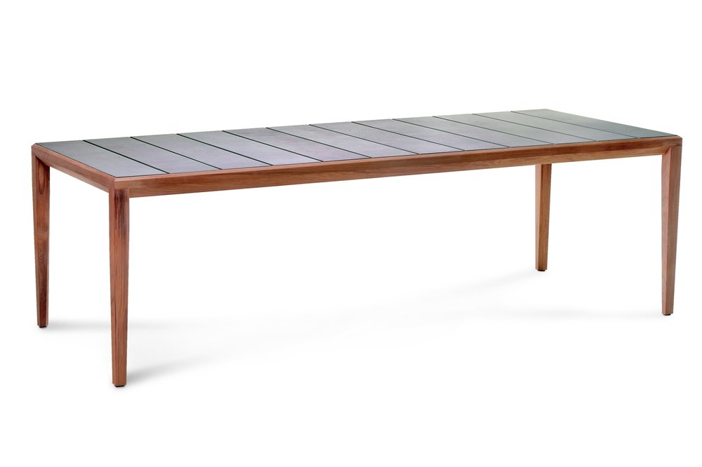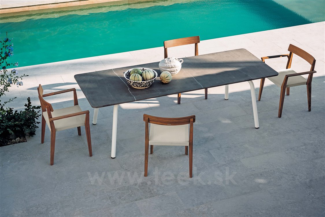 Kolekcia teakového dreva Teka Dining od spoločnosti Roda. Kolekcia obsahuje jedálenské kreslo, jedálenskú stoličku s teakovou konštrukciou a textilným výpletom (Canatex), jedálenské stoly rôznych veľkostí s teakovým rámom a keramickou doskou (s glazúrou alebo bez nej).