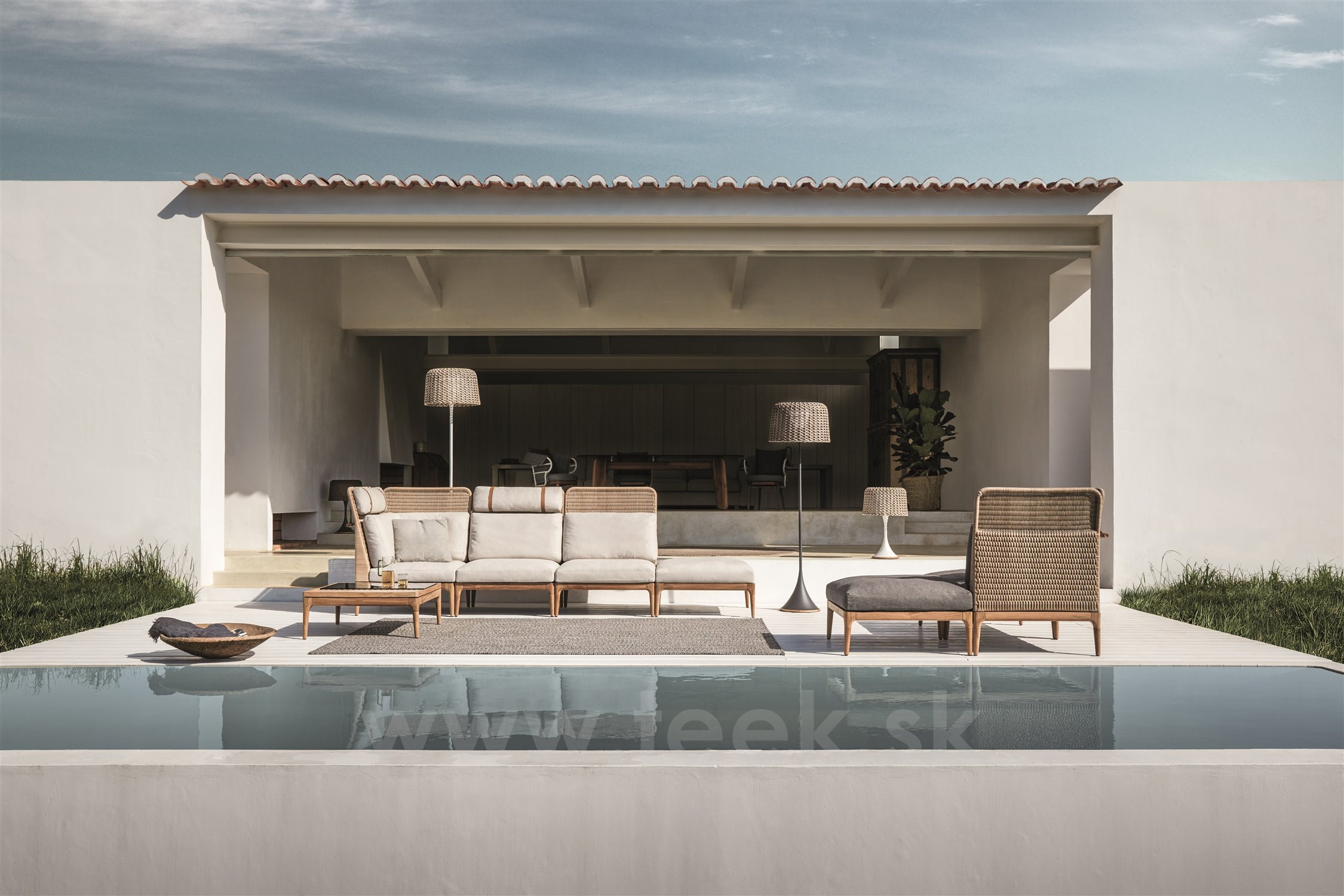 Rám: teakové drevo Prútie: poškriabaný umelý ratan Vankúše na sedenie: vonkajšia tkanina - farba podľa vzoru, výplne v kvalite outdoor. Rozmery: rohový diel s normálnou výškou operadla 81x81x78 cm (š x h x v)