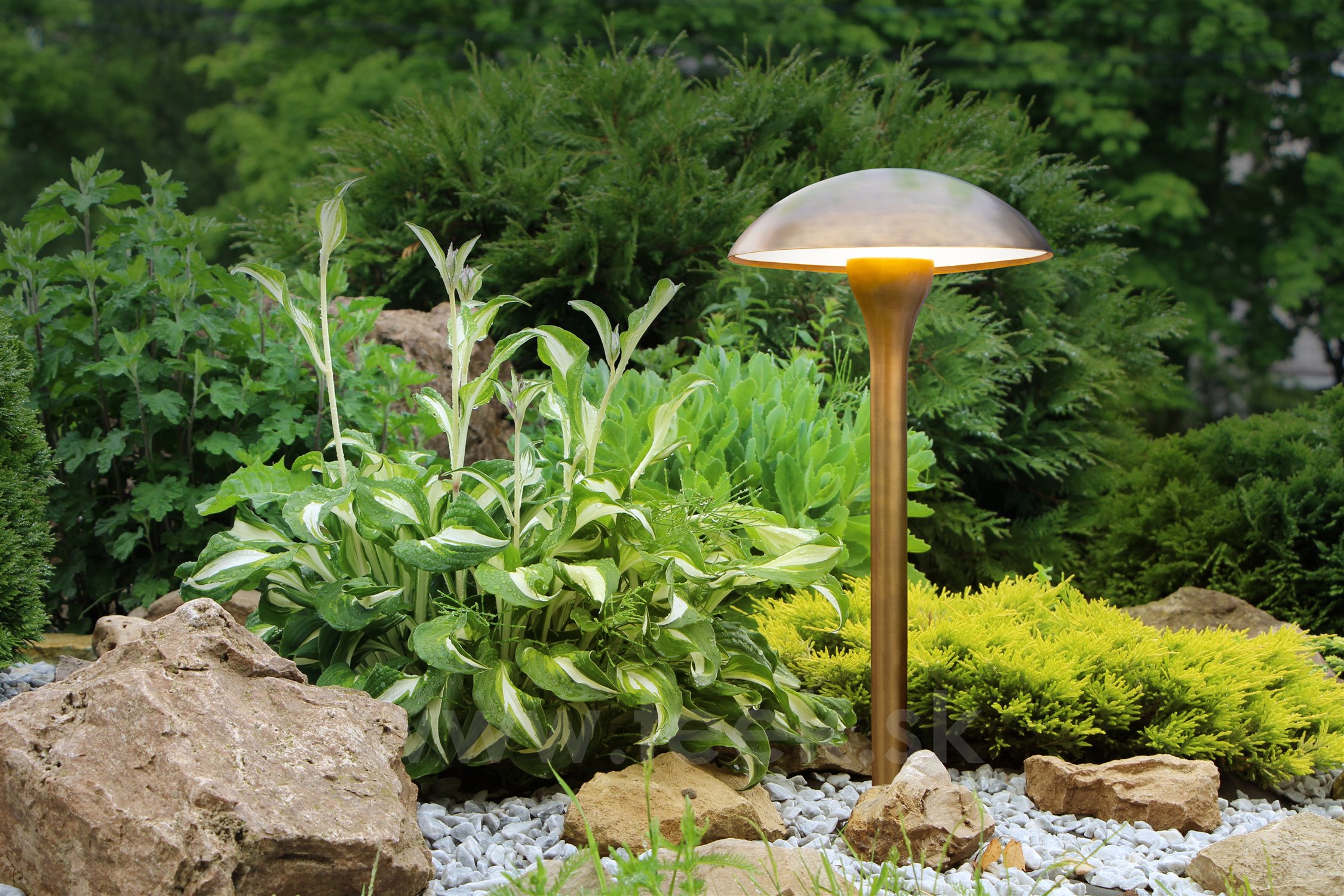 Dizajnová vonkajšia stojaca lampa v tvare huby.
