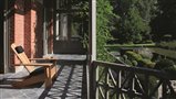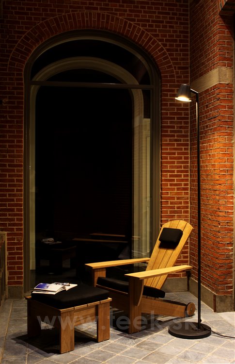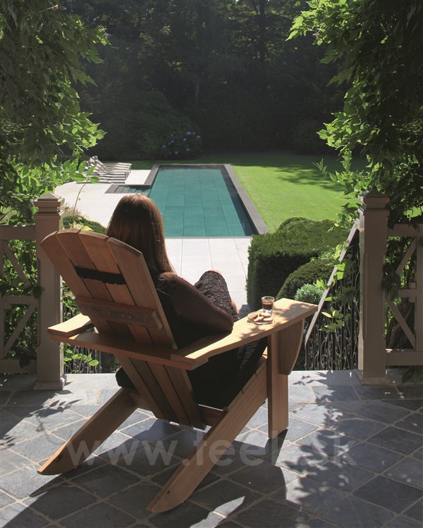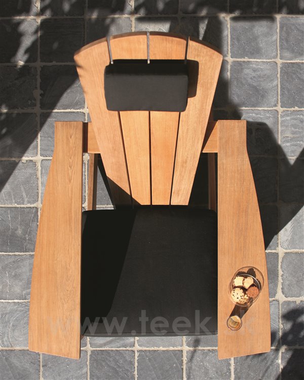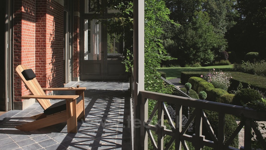 Nízke relaxačné záhradné kreslo a podnožka/skladací stolík New England od spoločnosti Royal Botania sú vyrobené z masívneho teakového dreva.