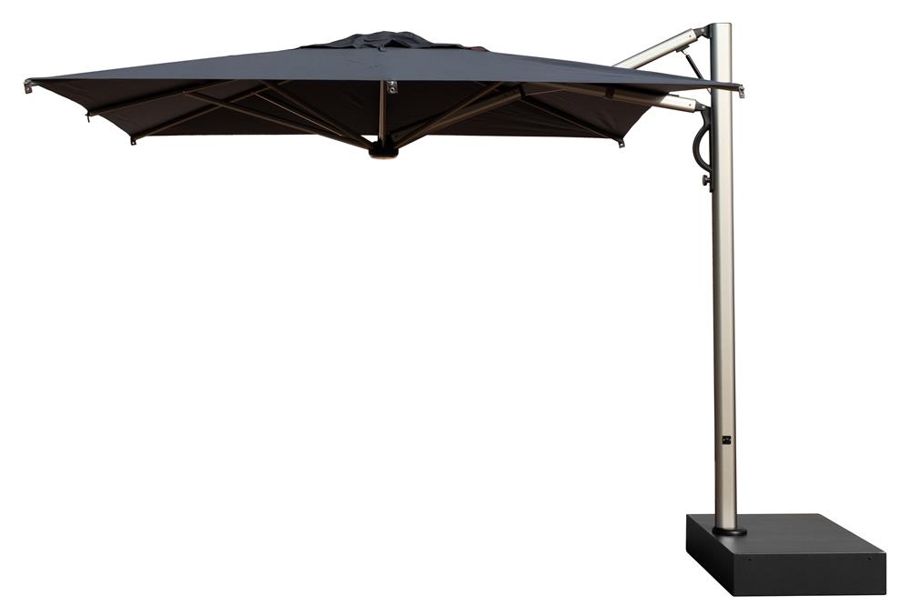 Slnečník s inovatívnym systémom otvárania a zatvárania asistovaným plynovou pružinou. Zasúvacia konštrukcia umožňuje otváranie a zatváranie nad stolmi a stoličkami bez nutnosti presúvať nábytok. Moderný produkt s hliníkovým rámom v titanovom vzhľade, vhodný pre exkluzívne prostredie.