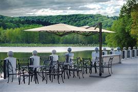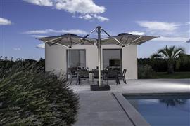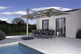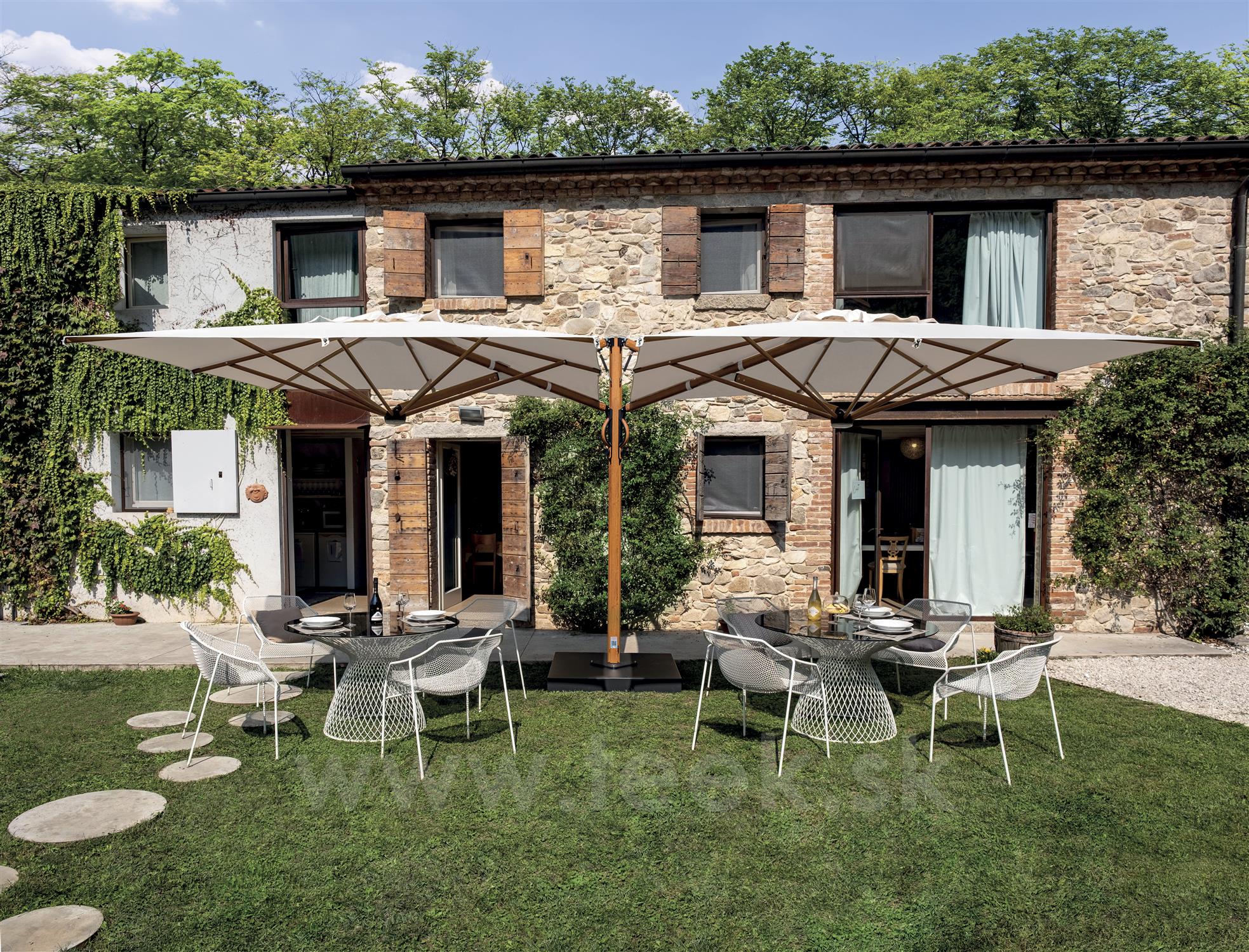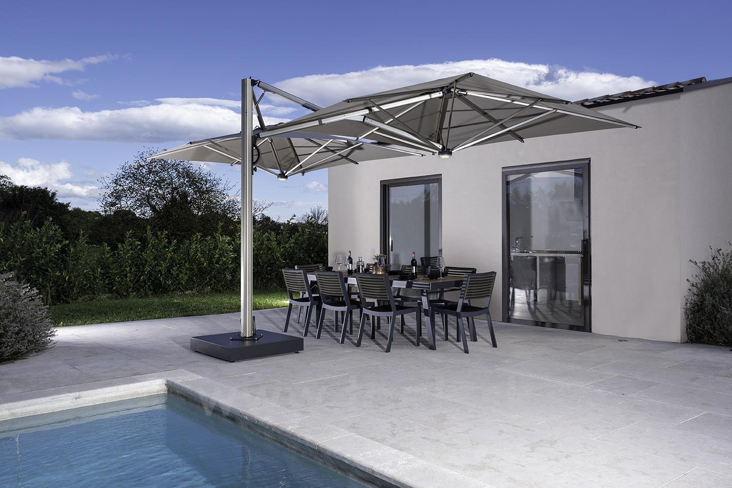 Evolúcia samostatného slnečníka Astro s inovatívnym systémom otvárania a zatvárania asistovaným plynovou pružinou. Zasúvacia konštrukcia umožňuje otváranie a zatváranie nad stolmi a stoličkami bez nutnosti presúvať nábytok. Vhodný do všetkých prostredí a odporúčaný najmä pre komerčné využitie (bary, reštaurácie, hotely či terasy). Hliníkový rám. Robustná konštrukcia zložená z dvoch slnečníkov vedľa seba, ukotvených na jednom spoločnom nosiči.