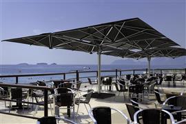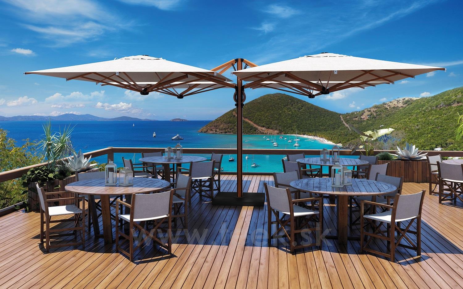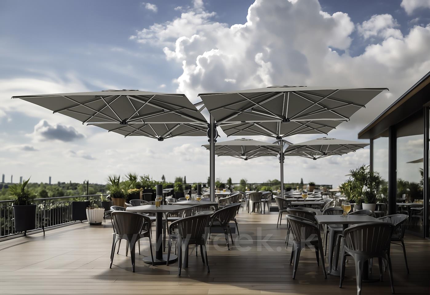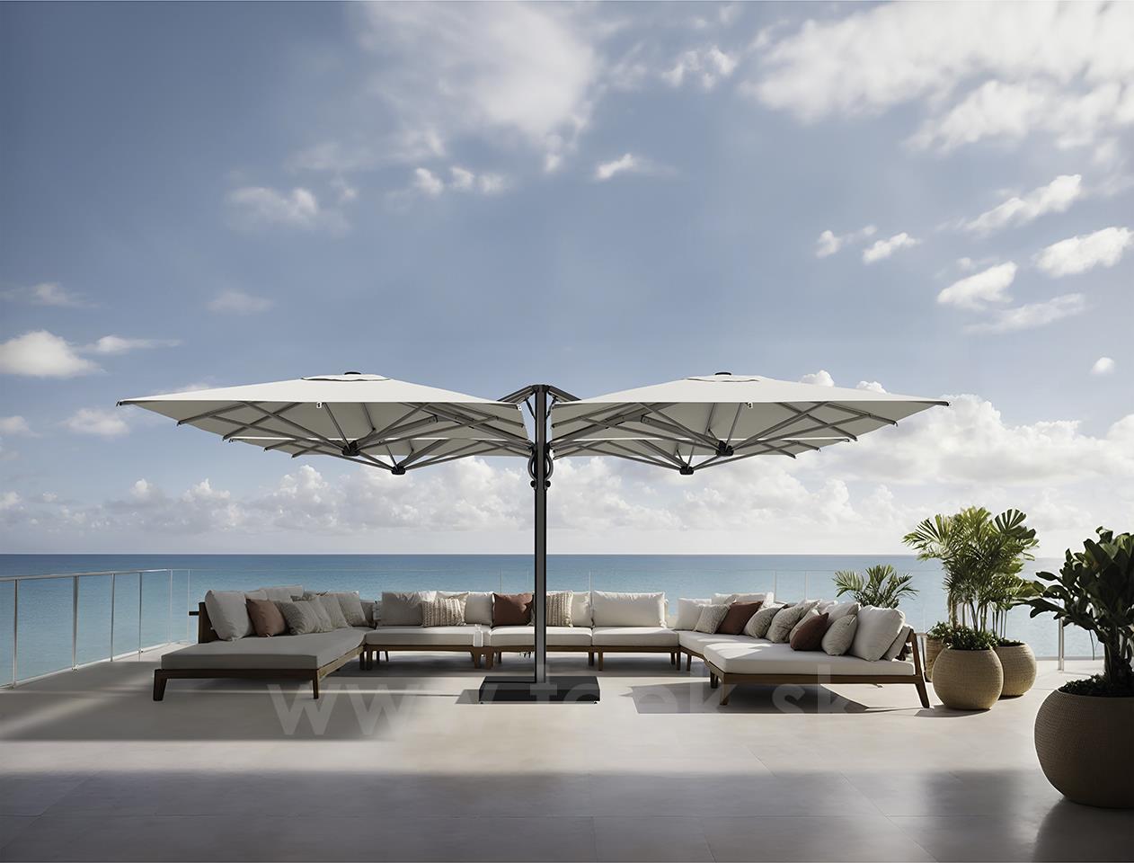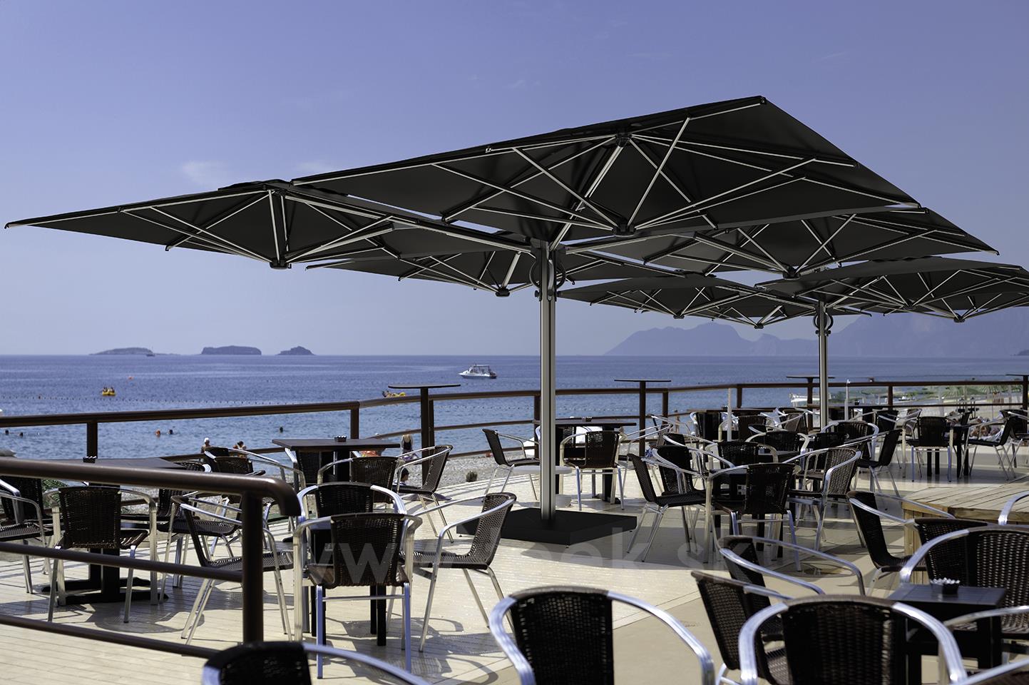 Evolúcia samostatného slnečníka Astro s inovatívnym systémom otvárania a zatvárania asistovaným plynovou pružinou. Zasúvacia konštrukcia umožňuje otváranie a zatváranie nad stolmi a stoličkami bez nutnosti presúvať nábytok. Vhodný do všetkých prostredí a odporúčaný najmä na komerčné využitie (bary, reštaurácie, hotely a terasy). Hliníkový rám. Robustná konštrukcia zložená zo štyroch slnečníkov ukotvených na jednom spoločnom nosiči.