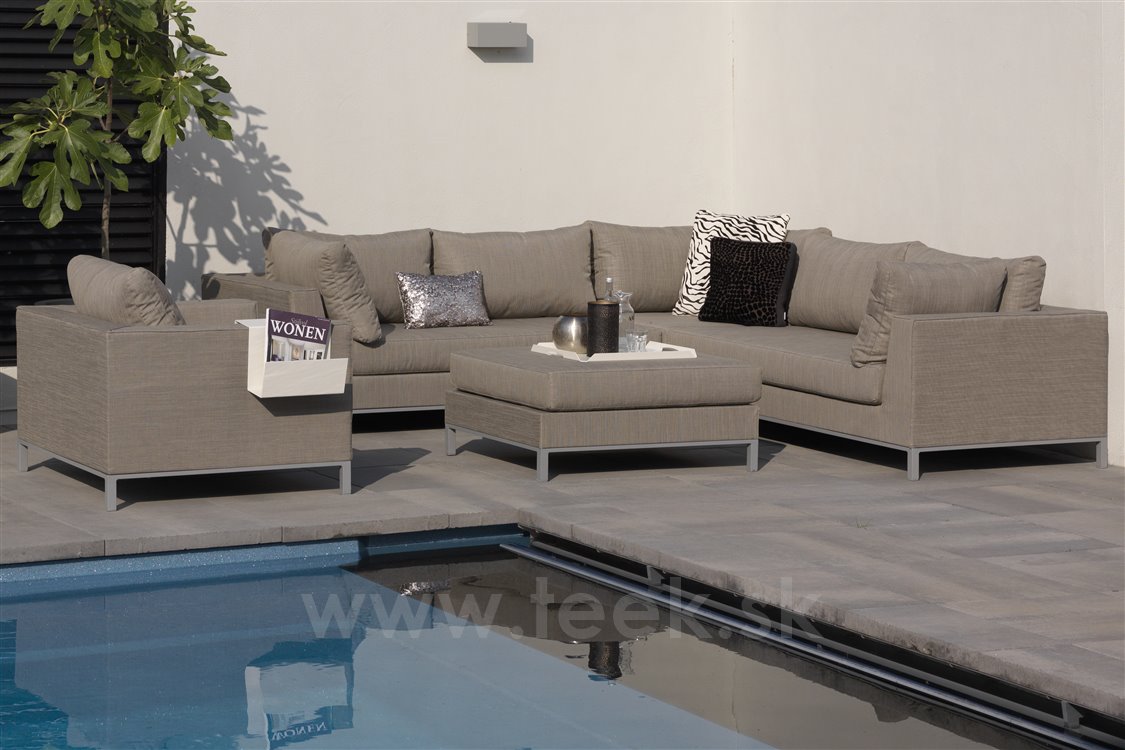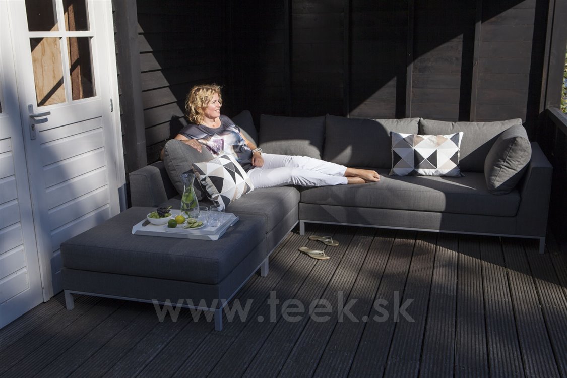 Sedací sestava Sicilie rohová značky Persoon. Sedací sestava má hliníkovou konstrukci, potahy z venkovní látky Nanotex (velmi odolná látka proti povětrnostním vlivům, UV rezistentní, světlostálá, snadno se udržuje a čistí). Výplň sedáků je chráněna voděodolnými obaly, které zabraňují prrůniku vhkosti dovnitř.