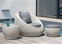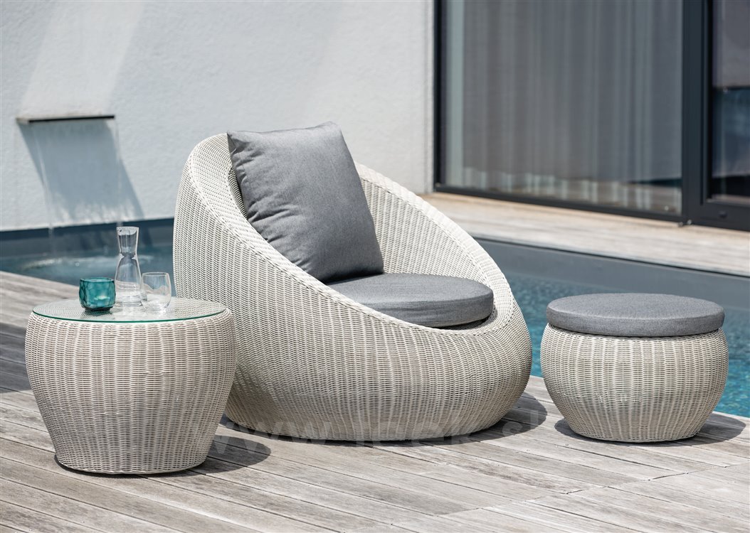 Relaxační křesla, stolky a podnožky z umělého ratanu s moderním designem.. Polstry mají výplně z běžné pěny, proto je nutné chránit je před deštěm. Dostupné ve více barvách.